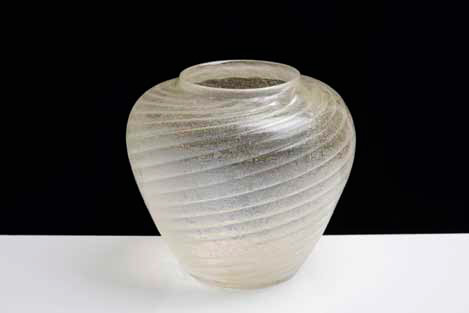 SEGUSO VETRI D’ARTE Vaso in vetro a cordonature diagonali, con inclusioni di foglia d’oro e la superficie acidata, disegno di Flavio Poli, 1940 circa. altezza cm 24, diametro cm 26.