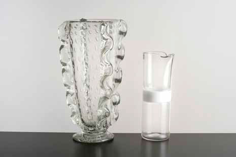 VENINI Caraffa in vetro incolore con fascia lattimo, anni ‘50. Etichetta: venini made in murano altezza cm 23.
