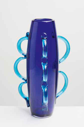 Venini Vaso “Dor” con tre applicazioni verticali a guisa di manici, disegno di Alessandro Mendini, 1988. Firma incisa: venini 88 Etichetta: VENINI MURANO MADE IN ITALY altezza cm 36,5. Bibliografia: Franco Deboni, I vetri Venini, Catalogo 1921-2007, volume II, Allemandi & C ed. 2007, fig. 340