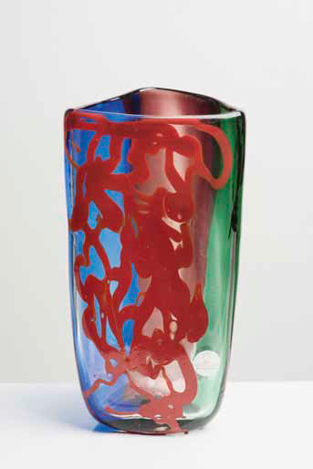 FULVIO BIANCONI Vaso a sezione triangolare con fili rossi, 1989. Firma incisa: Venini 1989 F. Bianconi P.d.A. altezza cm 30.