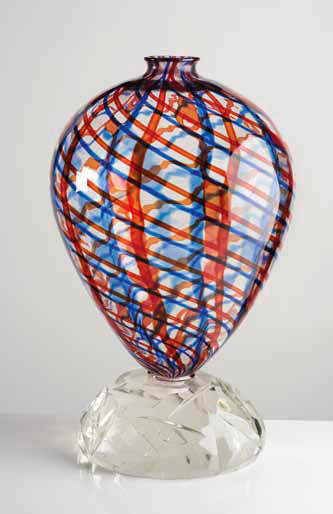 ALESSANDRO MENDINI Vaso “Simirone” in vetro a fasce policrome diagonali su base in vetro massello modellata alla routa. altezza cm 40. Bibliografia: Franco Deboni, I vetri Venini, Catalogo 1921- 2007, volume II, Allemandi & C ed. 2007, fig. 341.