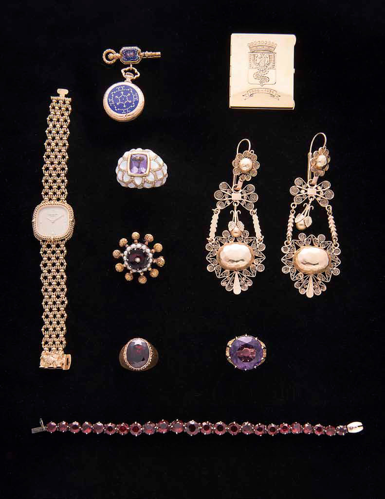 Spilla in oro giallo con microperle e cristallo viola centrale, gr. 7,00.