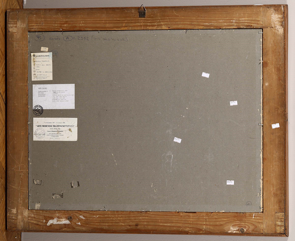 Enrico Prampolini (1894-1956), Bozzetto di scena, 1950, tecnica mista su cartoncino nero, cm 48x63 Timbro al retro della mostra Arte modenese tra Otto e Novecento, Poligrafo Artioli, Modena, 1987 Timbro al retro della Galleria Arte Centro, Milano Etichetta al retro della Galleria Fonte d’Abisso, Modena, Provenienza: Galleria Arte Centro, Milano, ivi acquistato dall’attuale proprietario Esposizioni: Arte modenese tra Otto e Novecento, Poligrafo Artioli, Modena, 1987, 19 dicembre 1987-17 gennaio 1988 Bibliografia: Catalogo Todi 1983 p. 36 IILA Roma 1974 n. 101 Ocam Modena 1978 n. 74