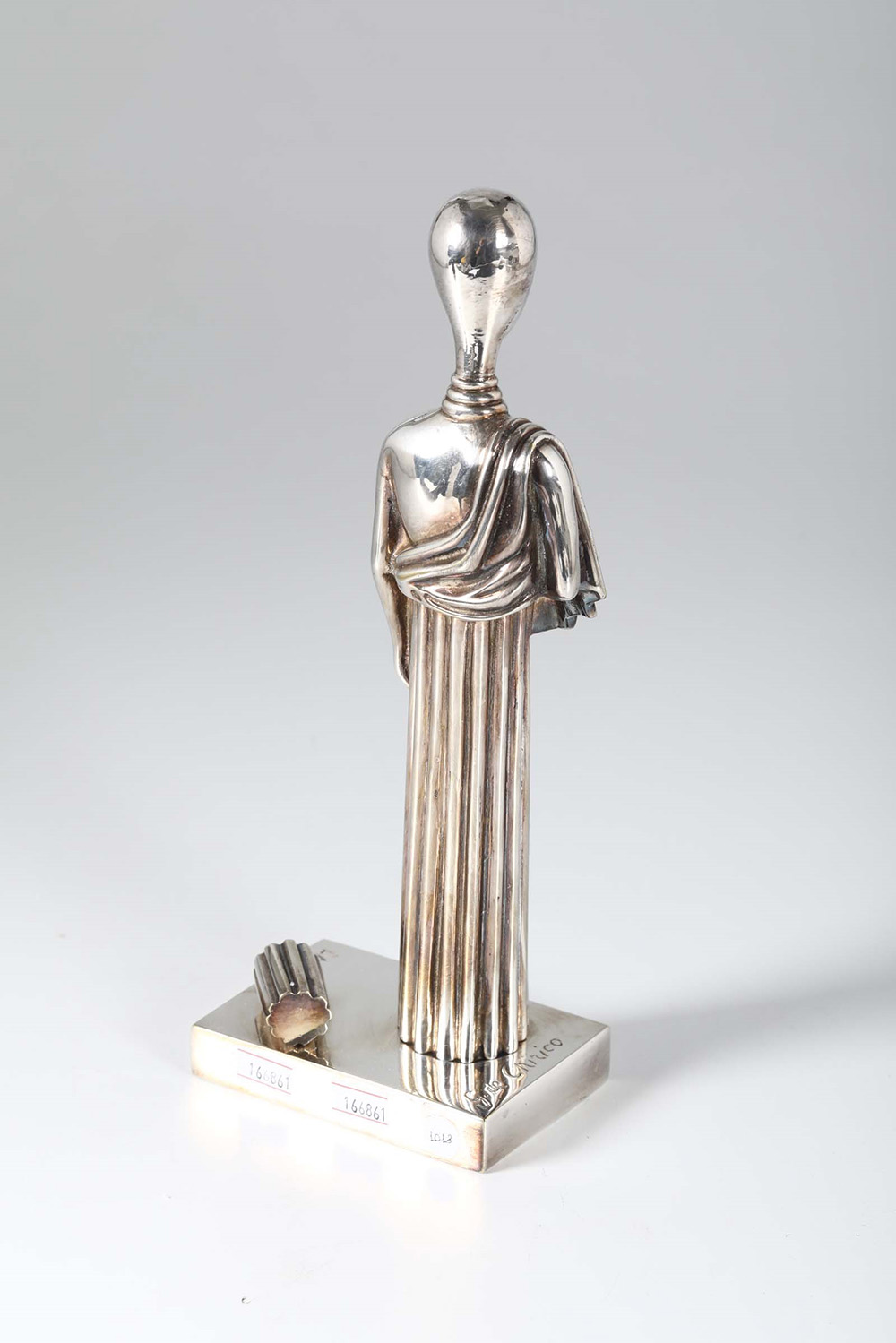 Giorgio De Chirico (1888-1978), La musa dell'archeologia, 1974, bronzo patinato argentato, altezza cm 31,5; base 7x8,5 firmata e intitolata sulla base es. 22/50 Fonderia Cavallari, Roma, Provenienza: Galleria La Medusa, Roma, ivi acquistato dall’attuale proprietario