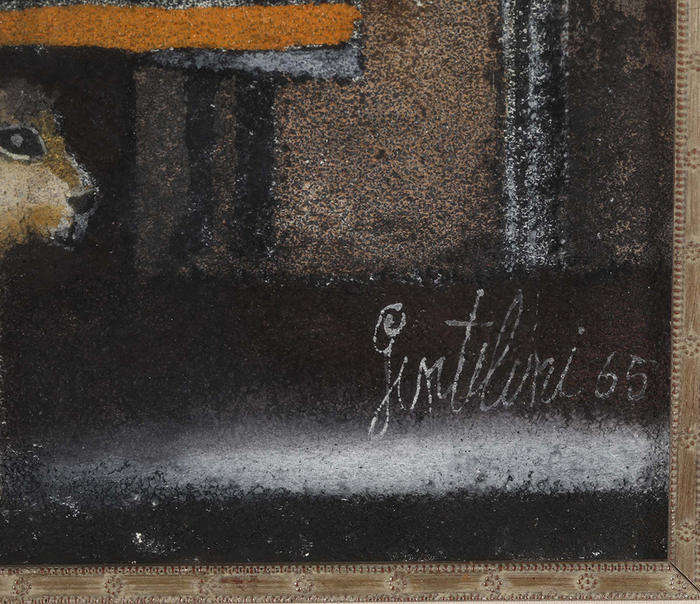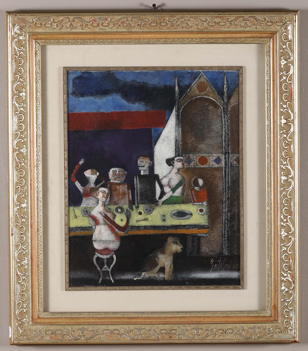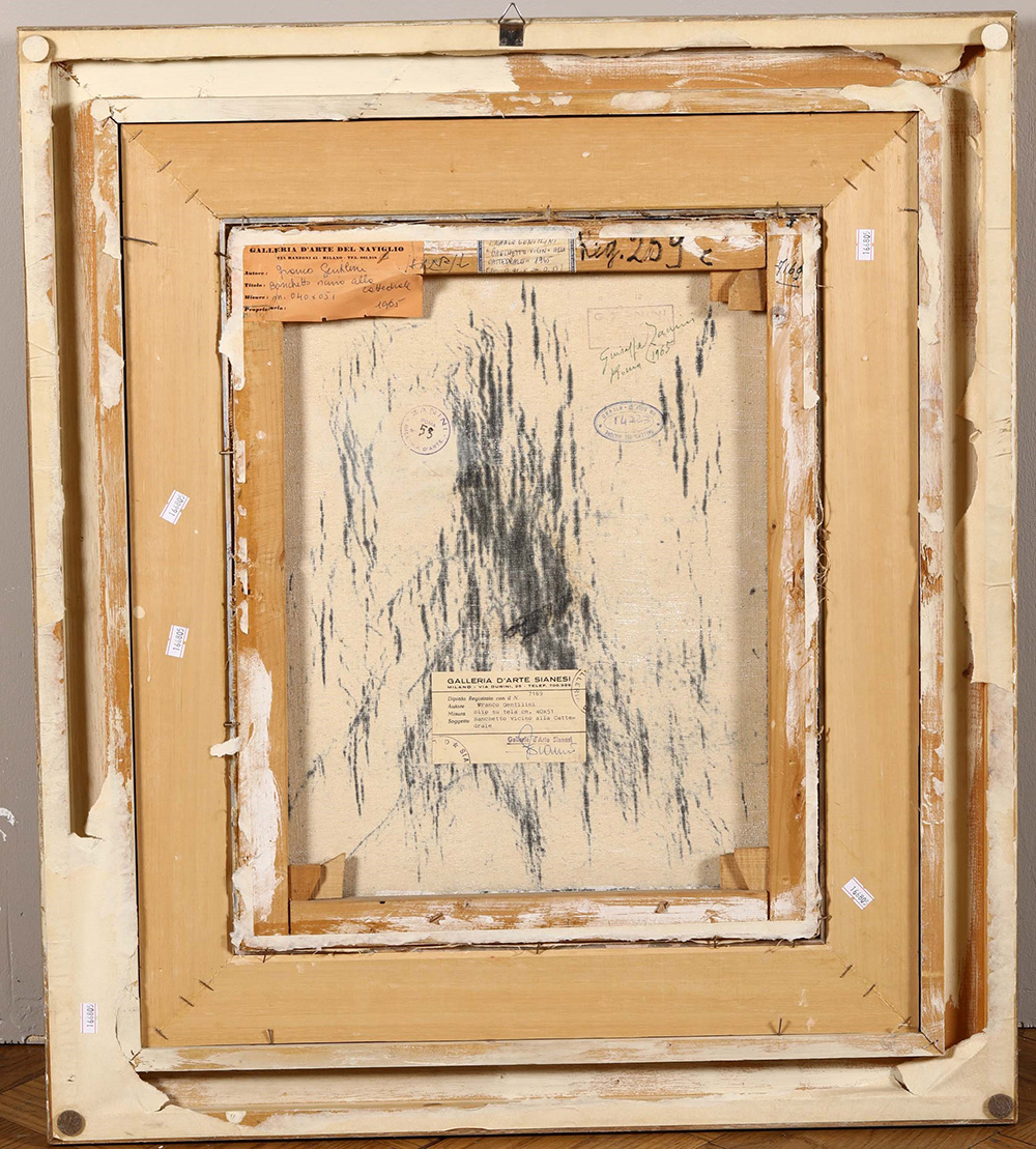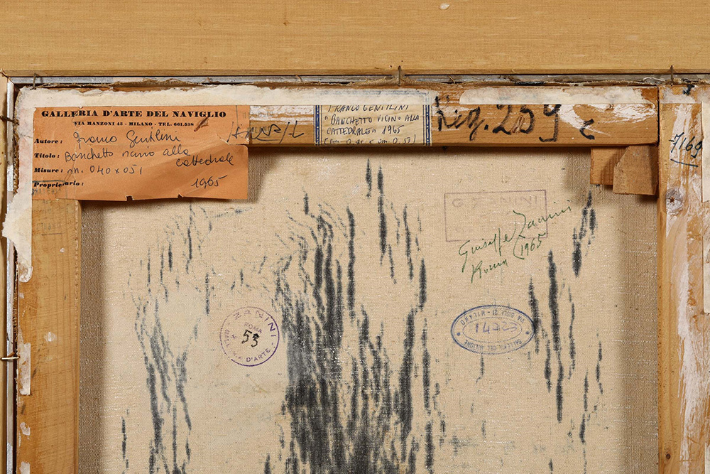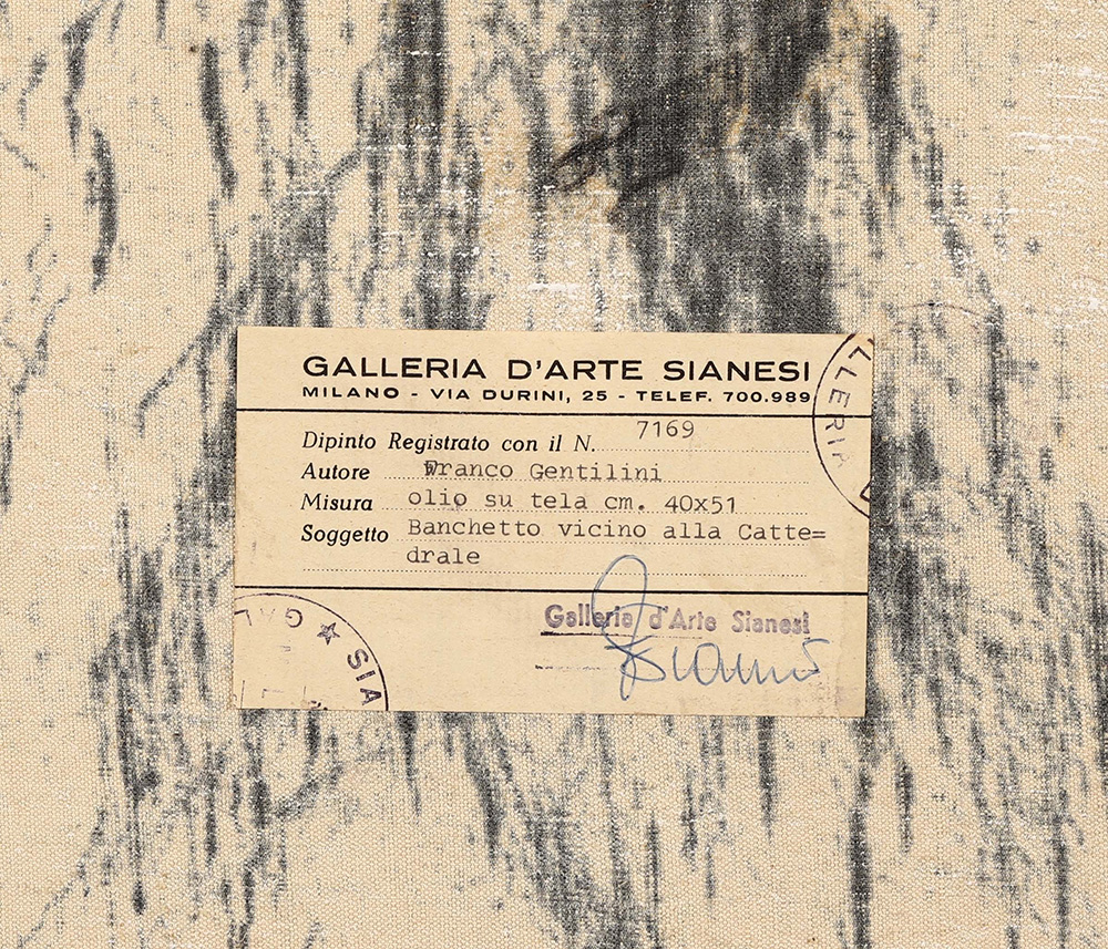Franco Gentilini (1909-1981), Banchetto vicino alla cattedrale, 1965, olio su tela, cm 51x40 firmato e datato in basso a destra Timbro al retro della Galleria Il Milione, Milano Timbro al retro della Galleria d'Arte Zanini, Milano Etichetta al retro della Galleria del Naviglio, Milano Etichetta al retro Galleria d'Arte Sianesi, Milano, Provenienza: Galleria d'Arte Il Naviglio, Milano Galleria d'Arte Sianesi, Milano, ivi acquistato dall’attuale proprietario negli anni ‘70 Bibliografia: Gentilini. Catalogo Generale dei dipinti (1923-1981), a cura di G. Appella, De Luca Editori d’Arte, Roma, 2000, n. 1007