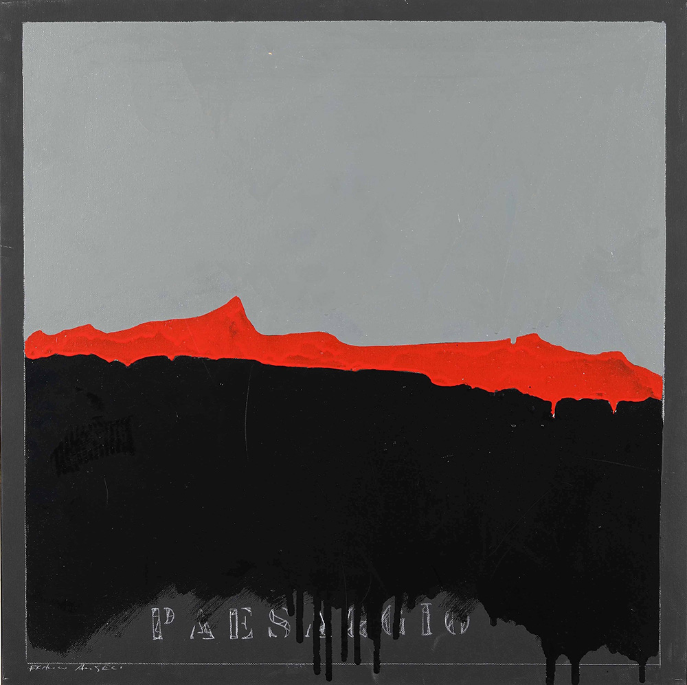Franco Angeli (1935-1988), Paesaggio, 1970-1975, tecnica mista su tela, cm 60x60 firmato in basso a sinistra Opera registrata presso l’Archivio Franco Angeli, Roma, in data 10 gennaio 2011 con il n. P-100111/34, Provenienza: Collezione privata, Roma, acquistato direttamente dall’artista