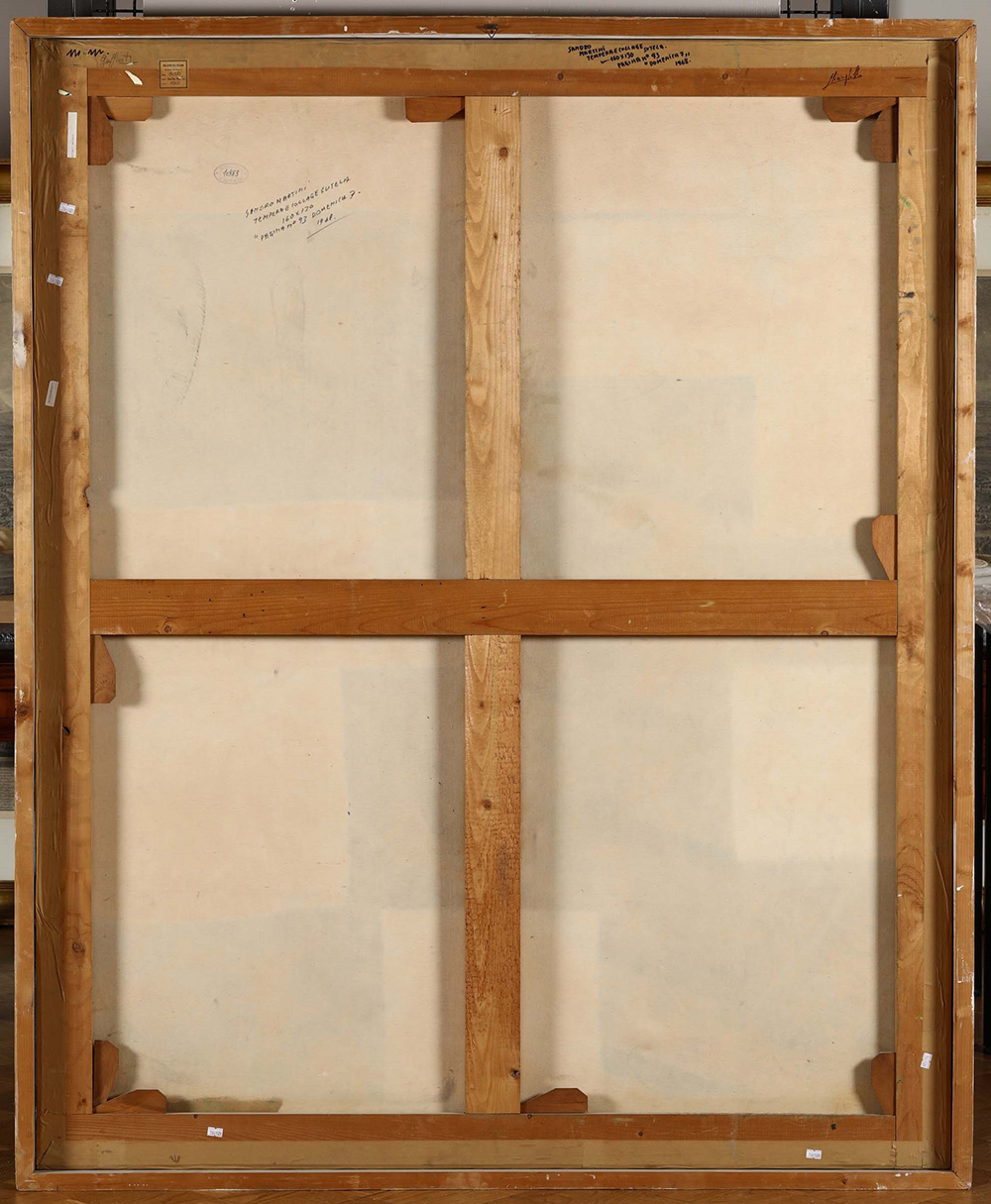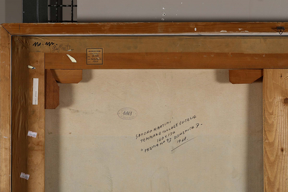 Sandro Martini (1941), Pagina n. 93 - Domenica 7, 1968, tempera e collage su tela, cm 160x130 firmato, intitolato e datato al retro Etichetta e timbro al retro della Galleria il Milione, Milano, Provenienza: Galleria Il Milione, Milano, ivi acquistato dall’attuale proprietario Esposizioni: Sandro Martini, Galleria il Milione, Milano, 1968, cat. ripr., quarta di copertina Bibliografia: De Periscoop, Antwerpen, maggio 1970, ripr. Sandro Martini, a cura di N. Vernizzi, Libri Scheiwiller, Milano, 2002, p. 77, ripr. (intitolato Pagina, n. 30) Sandro Martini. Catalogue Raisonné, a cura di Luigi Sansone, Postmedia Srl, Milano, 2017, p. 249 (ripr. b/n)