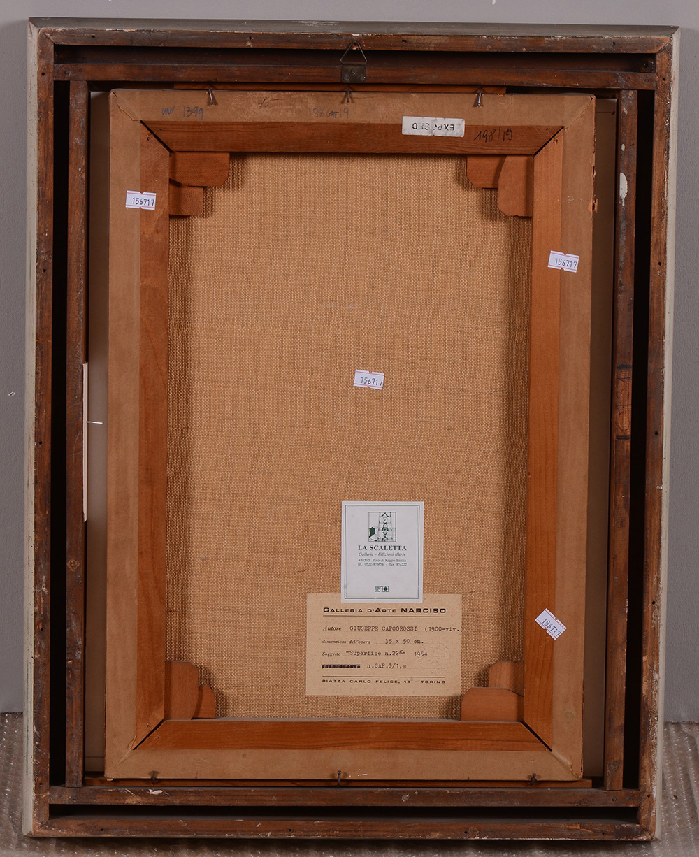 Giuseppe Capogrossi (1900-1972), Superficie n 22, 1954, tempera su carta intelata, cm 50x35 firmato e datato in alto a destra Etichette al retro: Galleria La Scaletta, S.Polo d’Enza, Reggio Emilia Galleria Narciso, Torino , Provenienza: Galleria La Scaletta, S.Polo d’Enza, Reggio Emilia Bibliografia: Il disegno Italiano Cat.19, Ed. 99/00, La Scaletta Editore, S.Polo d’Enza, Reggio Emilia