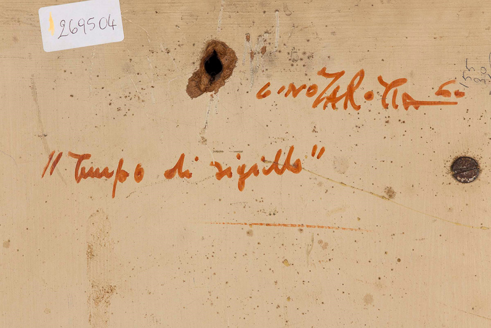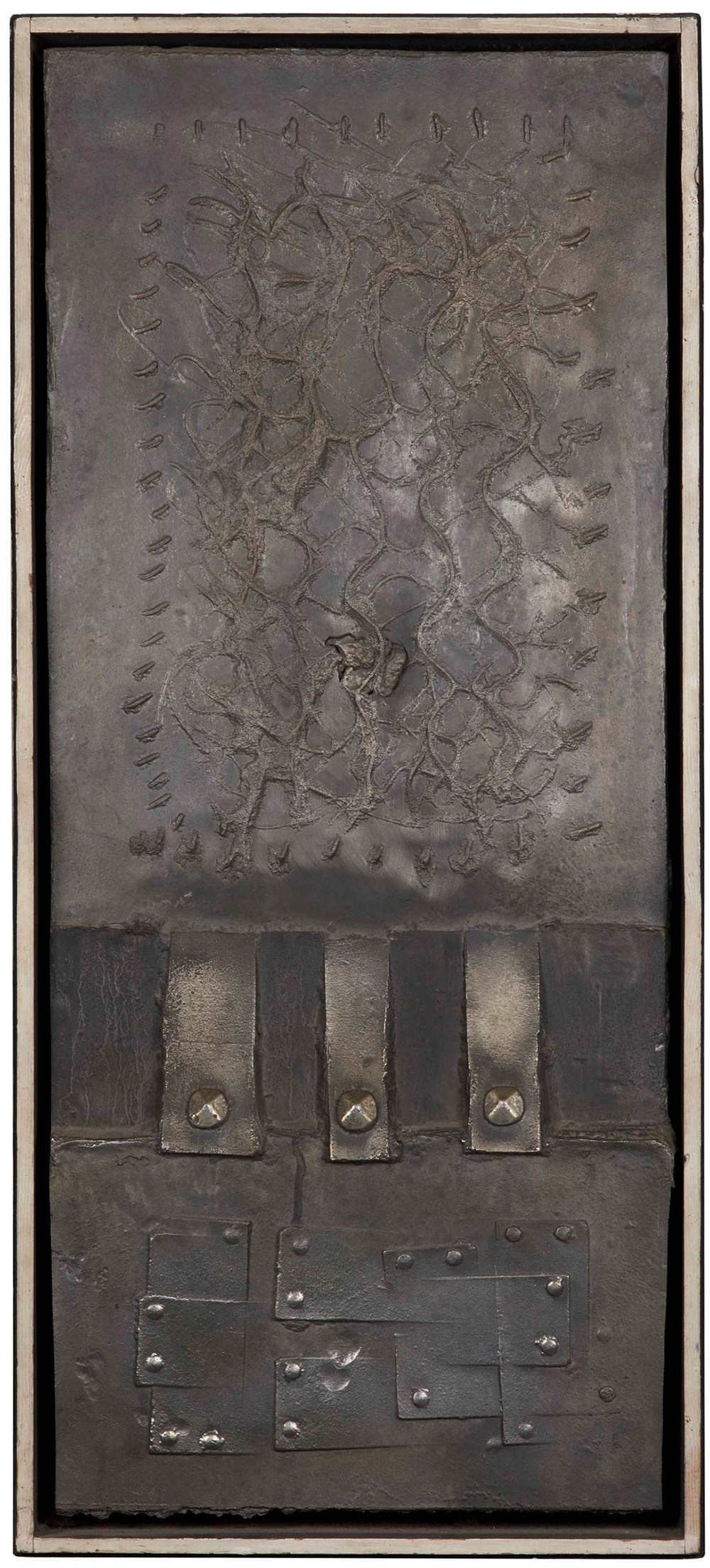 Gino Marotta (1935-2012), Tempo di Sigillo, 1960, alluminio, tecnica mista su tavola, cm 77x37 firmato, intitolato e datato al retro, Provenienza: Collezione VAF Stiftung, Francoforte sul Meno (n.1677 - P) Esposizioni: Materialbild - Material picture - Immagine materiale - Italia 1950-1965, a cura di P.Weibel, ZKM - Zentrum fur Kunst und Medientechnologie, Karlsruhe (Germania), 2008 Bibliografia: Materialbild - Material picture - Immagine materiale - Italia 1950-1965, a cura di P.Weibel, ZKM - Silvana Editoriale, Cinisello Balsamo (MI) 2008, pag.325 VAF Stiftung La collezione, Catalogo generale, a cura di Daniela Ferrari, Silvana Editoriale, Cinisello Balsamo (MI), 2012, p. 609 con il n. VAF 1677