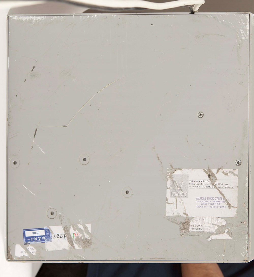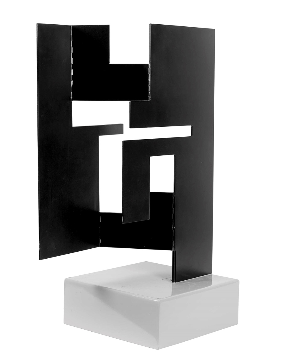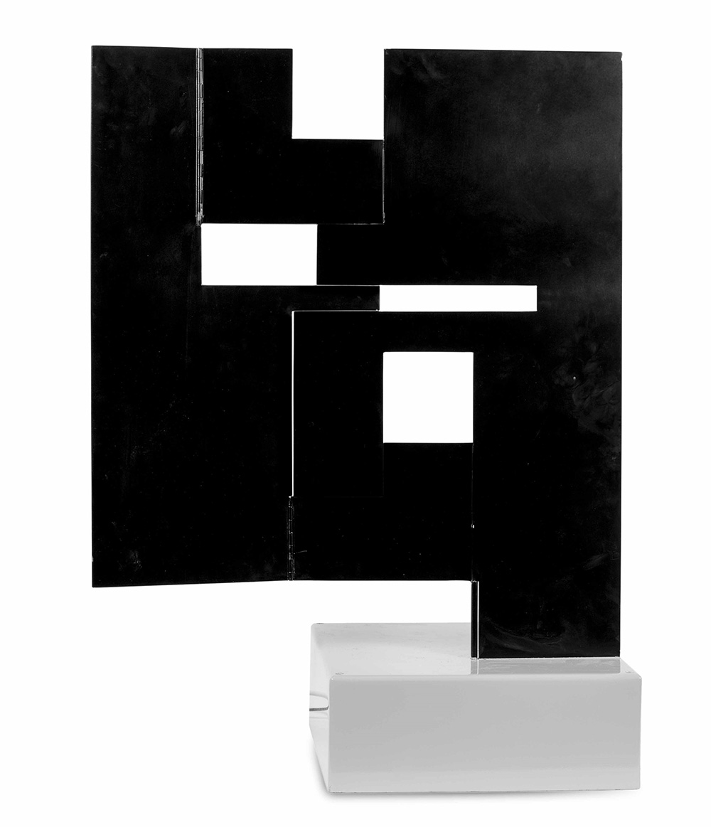 Bruno Munari (1907-1998), Negativo-positivo a tre dimensioni, ferro verniciato, elettromotore, cm 64x64x0,5 con la base: 87,5x84x37 ed. 2/8 Etichetta al retro del Valmore Studio d’Arte, Vicenza Autentica su fotografia dell’artista Progetto ideato nel 1956 in 8 esemplari motorizzati nelle dimensioni di 64 x 64 x 0,5 cm (a tutta apertura) n. 3 esemplari dell’altezza di 5 m, fissi o mobili. , Provenienza: Collezione VAF Stiftung, Francoforte sul Meno (n.1297) Esposizioni: ENNE & ZERO.Motus etc, Museion, Bolzano, 1996 ENNE & ZERO.Motus etc, Palazzo della Ragione, Padova, 1996 ENNE & ZERO.Motus etc, Galleria d’Arte Moderna e Contemporanea, Repubblica di San Marino, 1996 Percorsi riscoperti dell'arte italiana Vaf- Stiftung 1947-2010, a cura di G.Belli e D.Ferrari, Mart Museo di arte Moderna e Contemporanea di Trento e Rovereto, Rovereto, 2 luglio - 30 ottobre 2011 Arte programmatica e cinetica da Munari a Biasi a Colombo e..., a cura di Giovanni Granzotto e Mariastella Margozzi, Galleria Nazionale d’Arte Moderna, Roma, 23 marzo - 27 maggio 2012, (ripr. sul catalogo) Bibliografia: ENNE & ZERO.Motus etc, Editore Museion Bolzano, Bolzano, 1996 Percorsi riscoperti dell'arte italiana Vaf- Stiftung 1947-2010, a cura di G.Belli e D.Ferrari, Silvana Editoriale, Cinisello Balsamo (MI), 2011, pag.48 VAF Stiftung La collezione, Catalogo generale, a cura di Daniela Ferrari, Silvana Editoriale, 2012, p. 630 col n. VAF 1297 Arte programmatica e cinetica da Munari a Biasi a Colombo e..., a cura di G.Granzotto e M.Margozzi, Il Cigno GG Edizioni, Roma, 2012