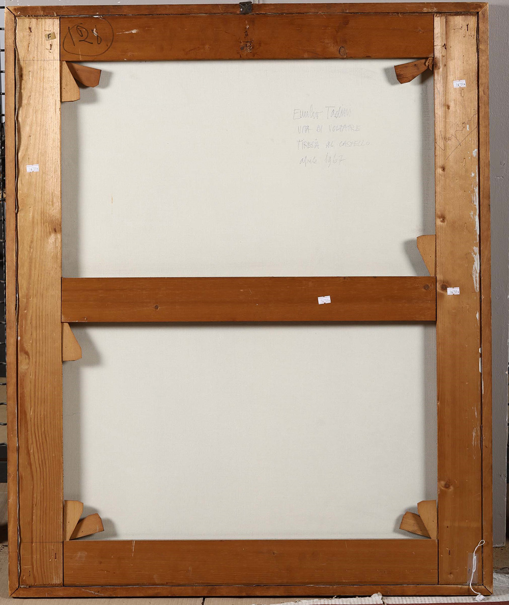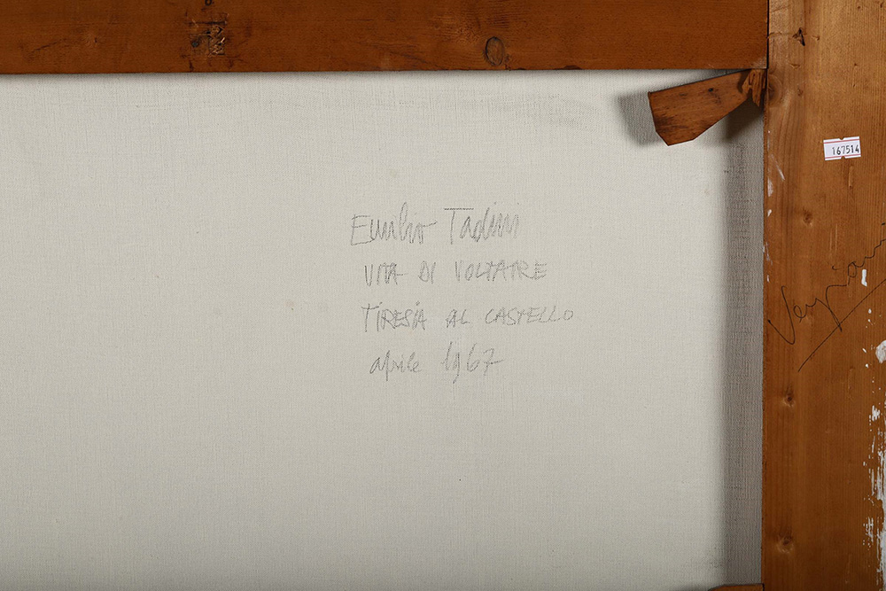 Emilio Tadini (1927-2002), Vita di Voltaire Tiresia al castello, 1967, olio su tela, cm 100x80 firmato, intitolato e datato al retro