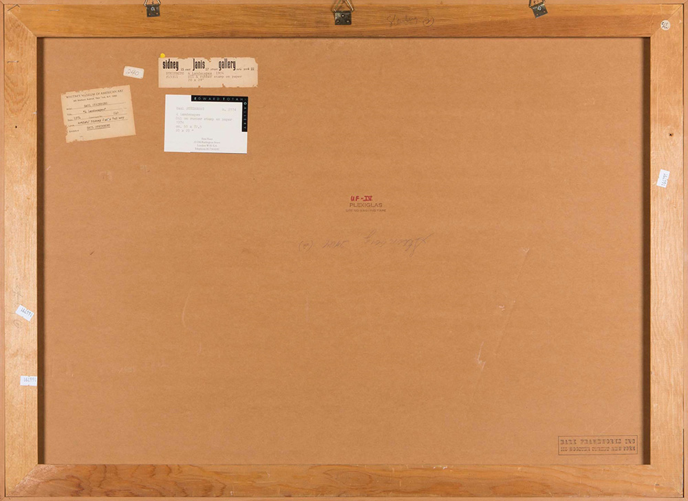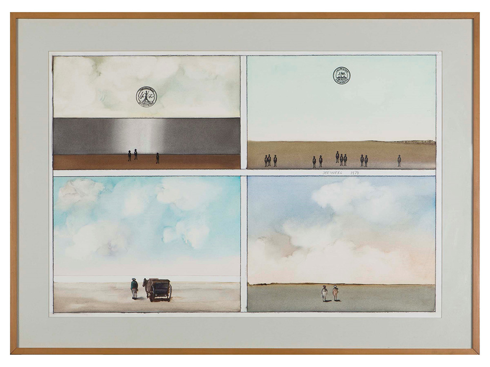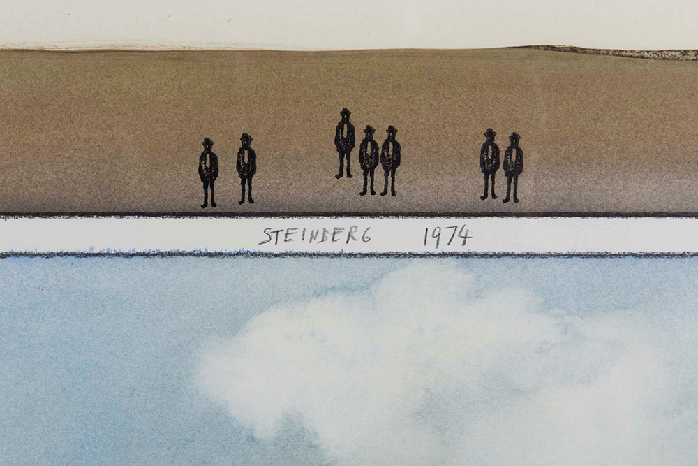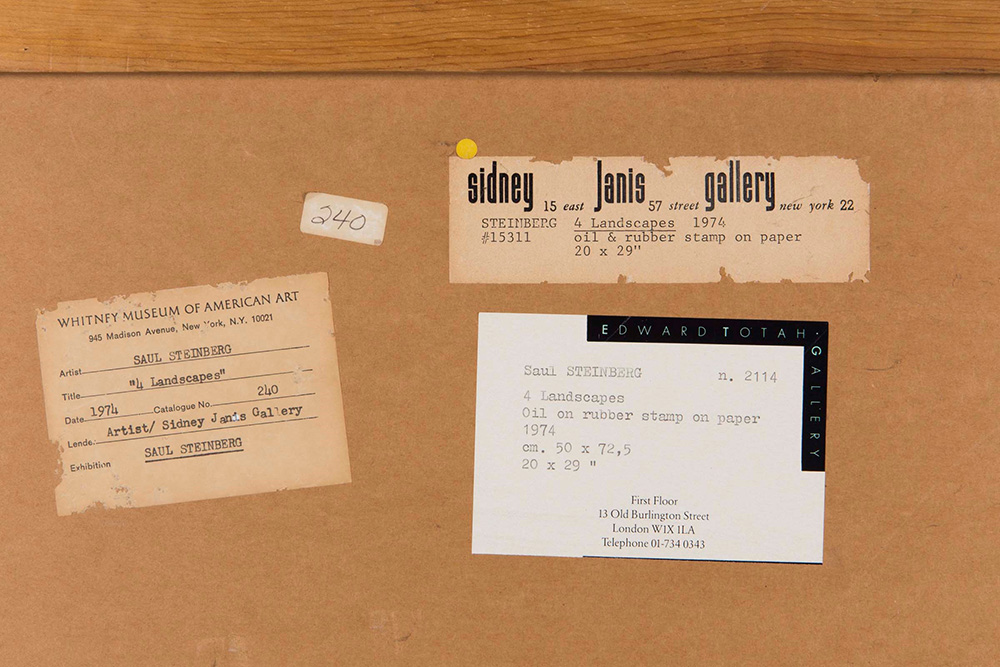 Saul Steinberg (1914-1999), 4 Landscape, 1974, olio e tecnica mista su carta, cm 50x72,5 firmato e datato al fronte Etichetta al retro del Whitney Museum of American Art, New York Etichetta al retro della Edward Totah Gallery, Londra Etichetta al retro della Sidney Janis Gallery, New York , Provenienza: Sidney Janis Gallery, New York Edward Totah Gallery, Londra Collezione privata Esposizioni: Saul Steinberg, Whitney Museum of American Art, New York, n. di cat.240, prestato dalla Sidney Janis Gallery, New York