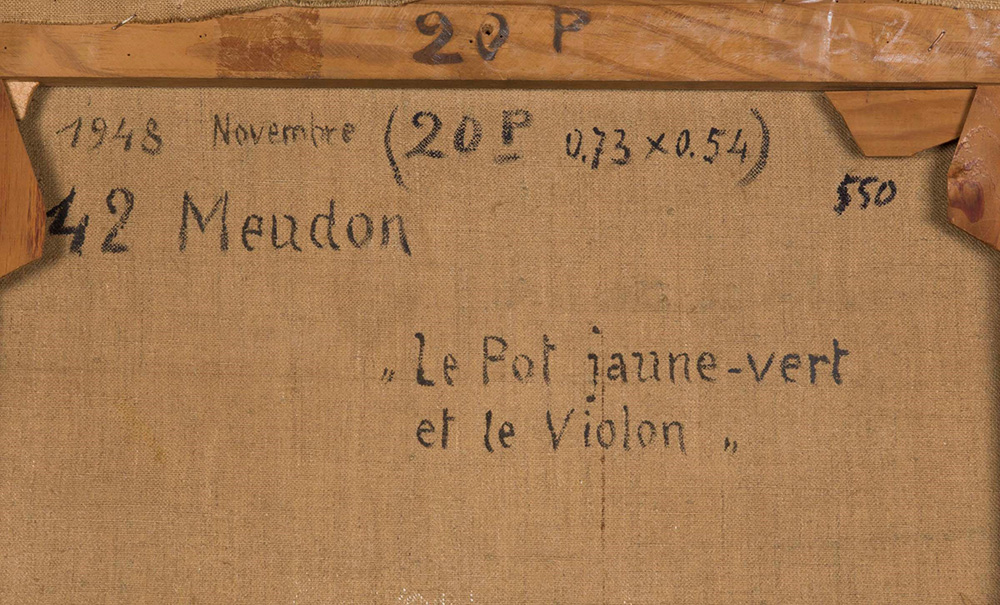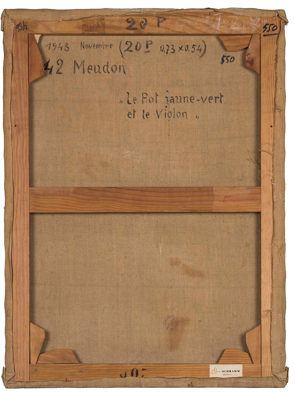 Gino Severini (1883-1966), Le Pot jaune-vert et le Violon, 1948, olio e tecnica mista su tela, cm 73x54 firmato in basso a destra intitolato e datato al retro “L’opera è inserita al n. 42 della lista dei lavori compilata a Meudon: nello stesso foglio è annotato anche un piccolo pastello, studio preparatorio per l’olio, che non è stato rintracciato” (citazione dal Catalogo Ragionato Gino Severini) , Provenienza: Cadby Birch Gallery, New York Collezione E. K. Allen, Florida Schramm Galleries, Florida Collezione privata Esposizioni: Personale dell’artista a New York, 1953 (citata nel catalogo ragionato) Bibliografia: Daniela Fonti, Catalogo Ragionato Gino Severini, Arnoldo Mondadori Editore, Edizioni Philippe Daverio, Milano, 1988, n. 838, p. 513