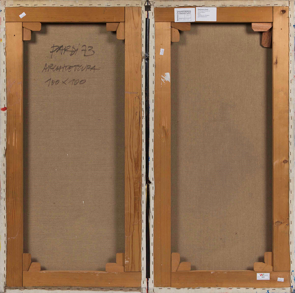 Gianfranco Pardi (1933-2012), Architettura, 1972, acrilico su tela e cavi d’acciaio, cm 100x100x7 firmato, datato e intitolato al retro Etichetta al retro dell’atelier dell’artista, Provenienza: Collezione VAF Stiftung, Francoforte sul Meno (n.430), donato dall’artista Esposizioni: Kunstverein Frankfurt, Frankfurt, 1999 Museum Bochum, Bochum, 1999 Kulthistorisches Museum Stralsund, Stralsund, 1999 Gianfranco Pardi. Opere 1968/2002, a cura di A. Maggi, Galleria Fumagalli, Bergamo, 2002, p. 15 ripr. Bibliografia: Giovanni Maria Accame, Gianfranco Pardi 1960/90, Fabbri Editore, Milano, 1991, p. 49 Gianfranco Pardi, Retrospektive 1972-1998, Edizioni Stefano Fumagalli, 1999, ripr. p. 5 AAVV, Gianfranco Pardi. Opere 1968/2002, Edizioni Galleria Fumagalli, Bergamo, 2002 VAF Stiftung La collezione, Catalogo generale, a cura di Daniela Ferrari, Silvana Editoriale, 2012, p. 639 col n. VAF 431