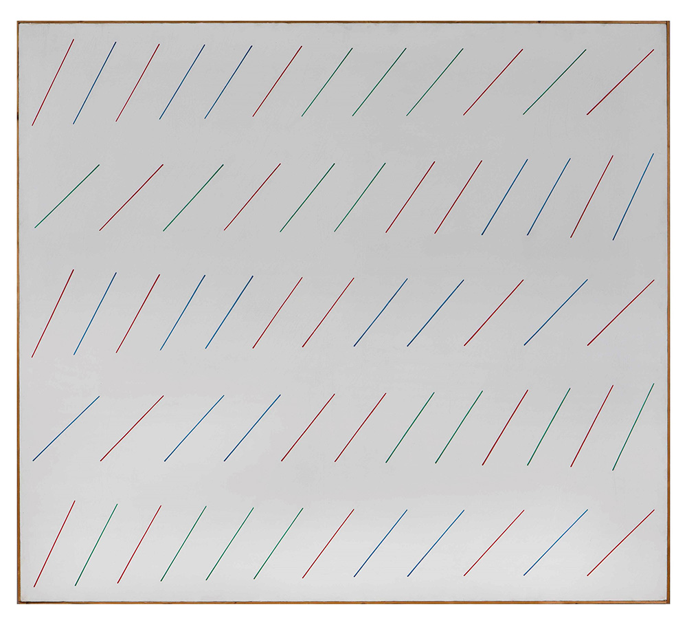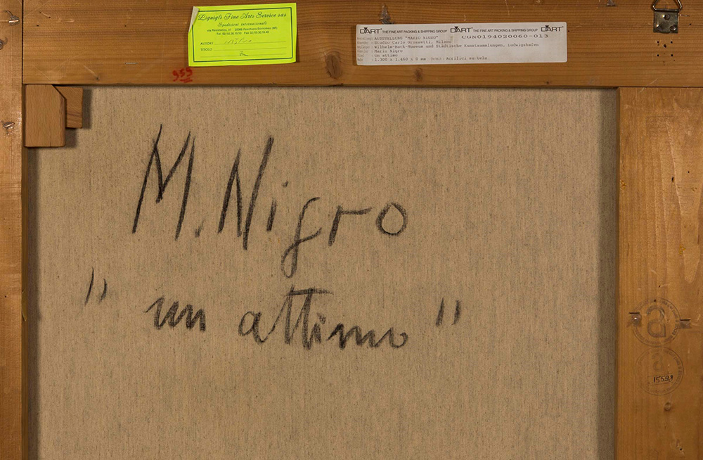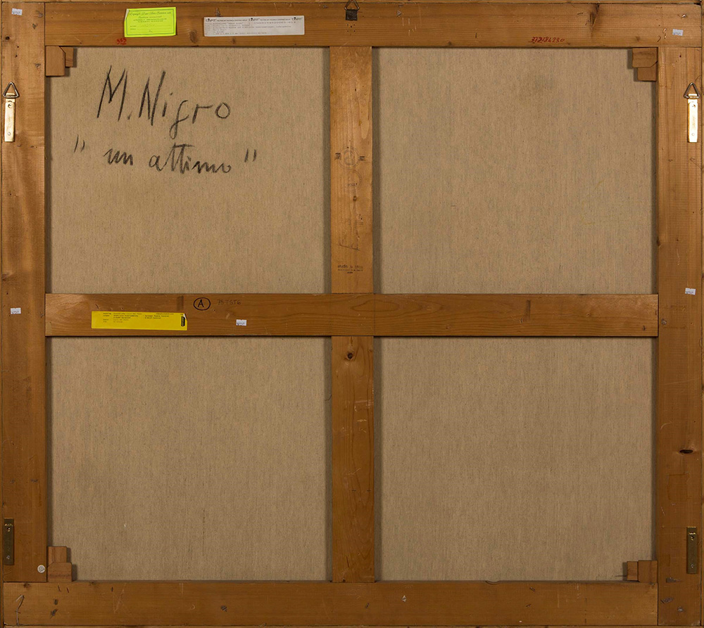 Mario Nigro (1917-1992), Un attimo, 1975, tempera su tela, cm 133x148 firmato e intitolato al retro, Provenienza: Collezione VAF Stiftung, Francoforte sul Meno (n.430) Esposizioni: Mario Nigro - Konzentration und Reduktion in der Malerei, a cura di K.Wolbert, Institut Mathildenhöhe, Darmstadt (Germania), 2000/2001 Bibliografia: Mario Nigro - Konzentration und Reduktion in der Malerei, a cura di K.Wolbert, Institut Mathildenhöhe Darmstadt(Germania), 2000, pag.55 Mario Nigro - Catalogo Ragionato, a cura di G.Celant, pubblicato con il numero 566 a pag.420, Skira Editore, 2009 VAF Stiftung La collezione, Catalogo generale, a cura di Daniela Ferrari, Silvana Editoriale, Cinisello Balsamo, 2012, p. 634 col n. VAF 430