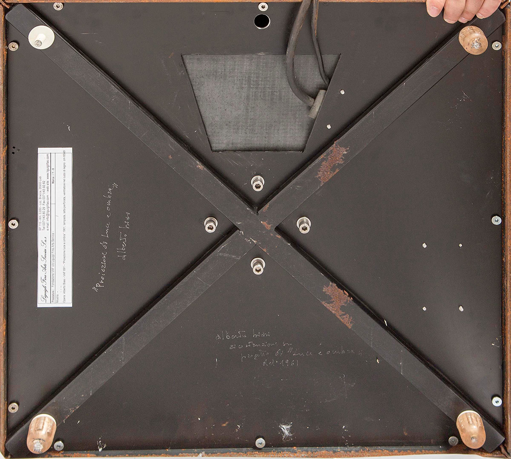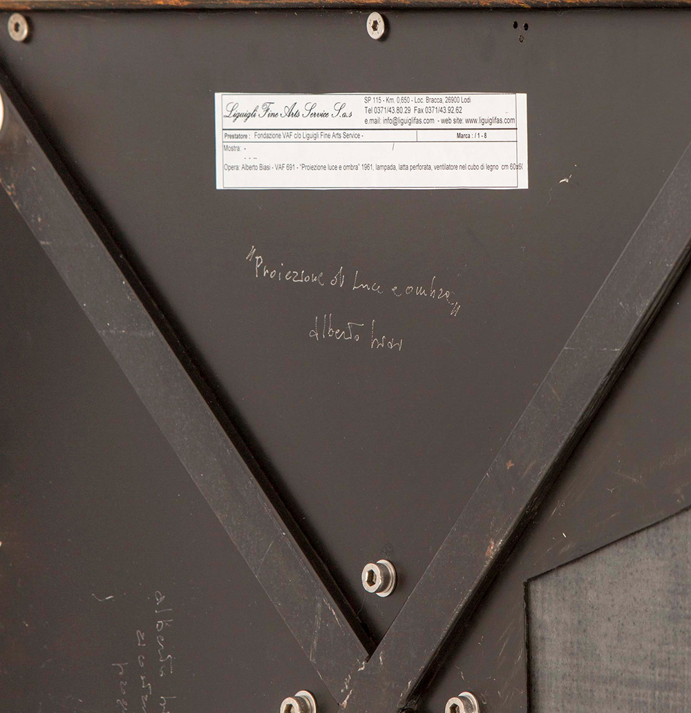 Alberto Biasi (1937), Proiezione di luce e ombra, 1961, lampada, latta perforata, ventilatore nel cubo di legno, cm 60x60x60 firmato, datato e intitolato sotto la base, Provenienza: Galleria Valmore, Vicenza Collezione VAF Stiftung, Francoforte sul Meno (n.691) Esposizione: L’Ultima Avanguardia - Arte programmata e cinetica - 1953/1963, a cura di L.Vergine, Palazzo Reale, Milano, 1983/1984 ENNE & ZERO.Motus etc, Museion, Bolzano, 1996 ENNE & ZERO.Motus etc, Palazzo della Ragione, Padova, 1996 ENNE & ZERO.Motus etc, Galleria d’Arte Moderna e Contemporanea, Repubblica di San Marino, 1996 Arte programmata e cinetica in Italia 1958-1968, a cura di M.Meneguzzo, Galleria d’arte Niccoli, Parma, 2000/2001 Arte programmata e cinetica in Italia 1958-1968, a cura di M.Meneguzzo, Galleria d’arte Niccoli, Museo d’arte, Nuoro, 2001 Luce, movimento & programmazione 1958-1968, a cura di V. Feierabend e M.Meneguzzo, dal 2001 al 2003, Ulmer Museum di Ulm (settembre-novembre 2001); Städtische Kunsthalle Museum di Mannheim (novembre 2001–febbraio 2002); Städtisches Museum di Gelsenkirchen (febbraio–aprile 2002); Stadtgalerie di Kiel (giugno–agosto 2002); Alpen-Adria-Galerie di Klagenfurt (dicembre 2002–marzo 2003) L’Occhio in Gioco - Opere tra percezione e optical, a cura di L.M.Barbero, Comune di Trissino (VI), 2003 Alberto Biasi - la concezione dinamica - percorsi recenti, a cura di G.Granzotto, Musei di San Salvatore in Lauro, Roma, 2003 La novelle révolution française et italienne des artistes latins - oeuvres de Alberto Biasi et Julio Le Parc, a cura di G.Granzotto, Maretti Arte Monaco, Montecarlo (Principato di Monaco), 2003/2004 Alberto Biasi, a cura di F.De Santi, Palazzo Ducale - Sale del Castellare, Urbino, 2004 Light art from artificial light - lichtkunst aus kunstlicht, a cura di P.Weibel e G.Jansen, ZKM - Zentrum fur Kunst und Medientechnologie, Verlag Hatje Cants, Ostfildern (Germania), 2005/2006 Alberto Biasi - Settanta, a cura di G.Barbero e G.Granzotto, Museo Nazionale di Villa Pisani, Venezia, 2007 Op Art, Schirn Kunsthalle, Frankfurt (Germania), 2007 Alberto Biasi - Kaleidoscope: Dalle trame agli assemblaggi, Museo di Palazzo Reale, Genova, 2009 Arte programmatica e cinetica da Munari a Biasi a Colombo e..., a cura di G.Granzotto e M.Margozzi, Galleria Nazionale d’Arte Moderna, Roma, 2012 Arte cinetica e programmata, Yamanashi Prefectural Museum of Art, Yamanashi (Japan), 2014, pag.154 Art in Europe 1945-1968. The Continent that the EU Does Not Know, a cura di E.Gillen e P.Weibel, ZKM - Zentrum fur Kunst und Medientechnologie, Karlsruhe (Germania), 2016/2017 Eye Attack, Stedelijk Museum Schiedam (Olanda), 2017 Bibliografia: Il gruppo N - la situazione dei gruppi in europa negli anni ‘60, a cura di I.Mussa, Bulzoni Editore, Roma, 1976 L’Ultima Avanguardia - Arte programmata e cinetica - 1953/1963, a cura di L.Vergine, Editore Mazzotta, Milano, 1983, pag.77