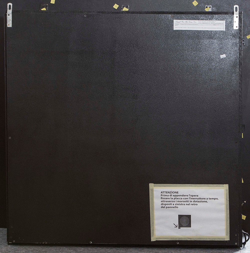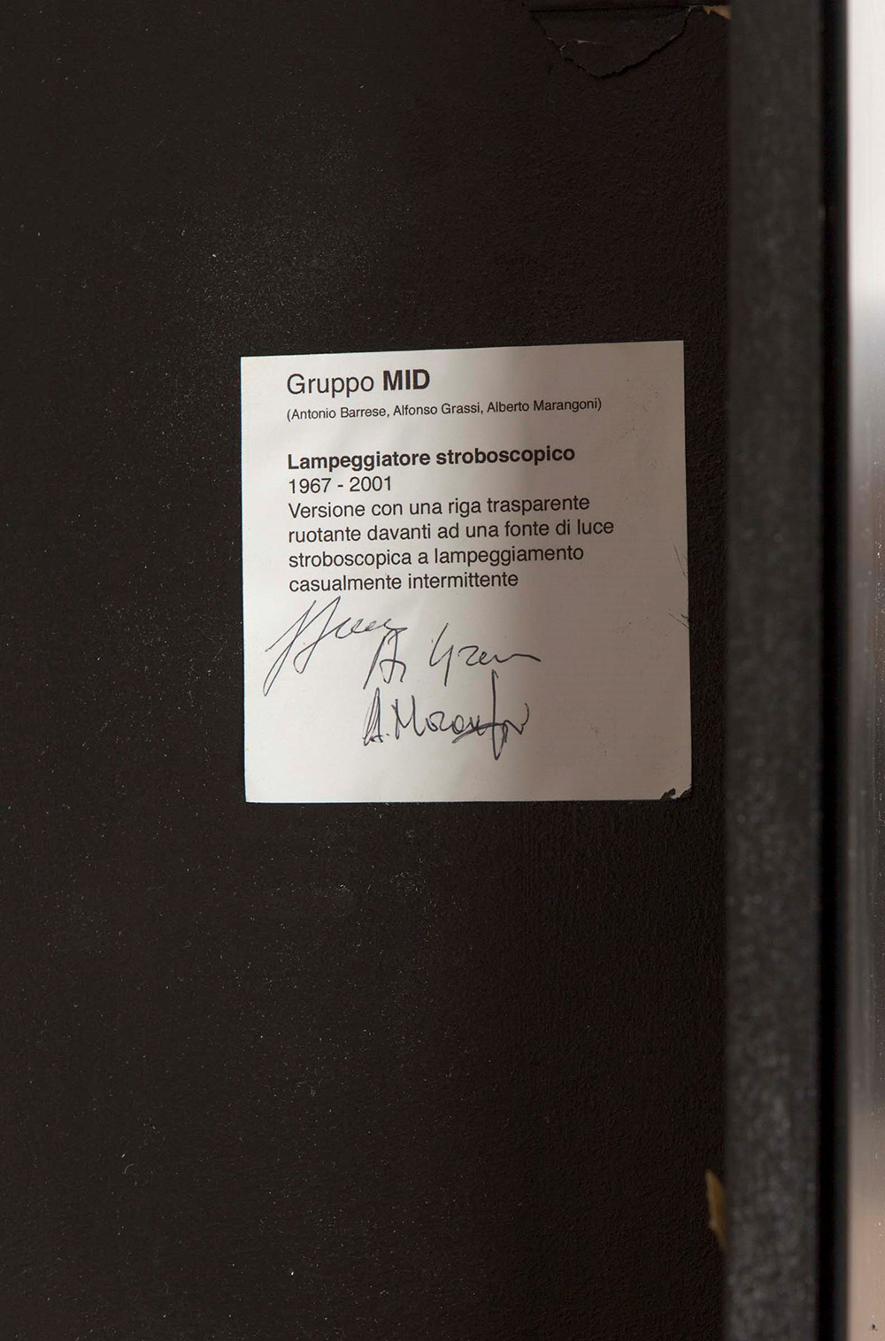 Gruppo MID, Lampeggiatore stroboscopico, 1967-2001, piattaforma girevole di plexiglas serigrafato, elettromotore, cm 130x130x20 firmato dal Gruppo MID al retro, Provenienza: Collezione VAF Stiftung, Francoforte sul Meno (n.823) Esposizioni: Luce, movimento & programmazione 1958-1968, a cura di V. Feierabend e M.Meneguzzo, dal 2001 al 2003, Ulmer Museum di Ulm (settembre-novembre 2001); Städtische Kunsthalle Museum di Mannheim (novembre 2001–febbraio 2002); Städtisches Museum di Gelsenkirchen (febbraio–aprile 2002); Stadtgalerie di Kiel (giugno–agosto 2002); Alpen-Adria-Galerie di Klagenfurt (dicembre 2002–marzo 2003) Un secolo di Arte italiana. Lo sguardo del collezionista. Opere della Fondazione VAF, a cura di V.Feierabend, E.Weiss, K.Wolbert), Mart, Rovereto, 2005 Bibliografia: Luce, movimento & programmazione - Kinetische Kunst aus Italien 1958-1968, a cura di V.W.Feierabend e M.Meneguzzo, Silvana Editore, Cinisello Balsamo (MI), 2001, pag.158 Un secolo di Arte italiana. Lo sguardo del collezionista. Opere della Fondazione VAF, a cura di V.Feierabend, E.Weiss, K.Wolbert, Mart, Rovereto, Skira, 2005, pag.227 VAF Stiftung La collezione, Catalogo generale, a cura di Daniela Ferrari, Silvana Editoriale, 2012, p. 583 con il n. 823