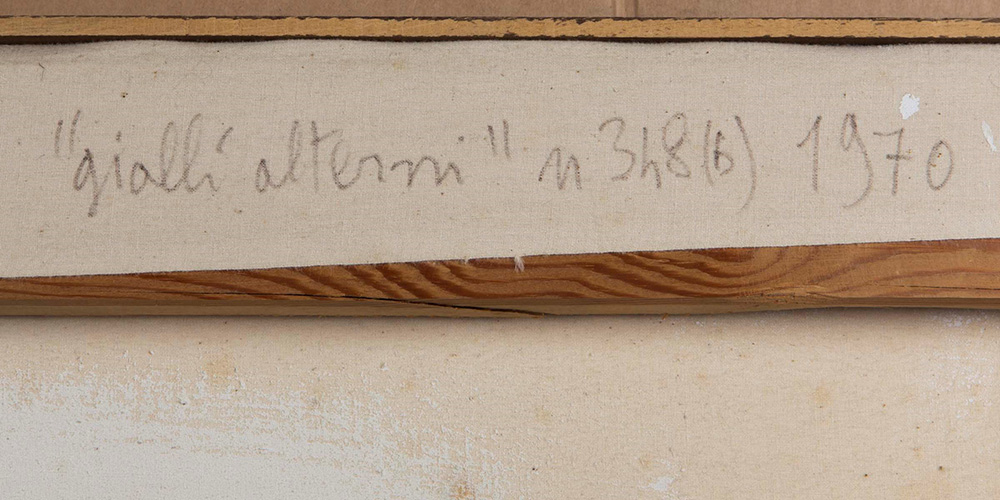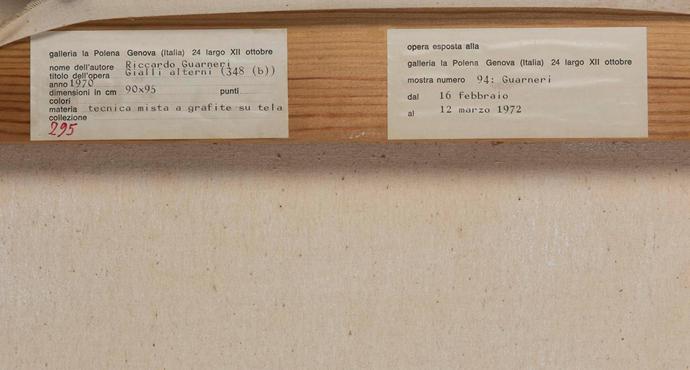 Riccardo Guarneri (1933), Gialli alterni, 1970, tecnica mista e grafite su tela, cm 95x90 firmato al retro, Provenienza: Collezione VAF Stiftung, Francoforte sul Meno (n.1628) Bibliografia: VAF Stiftung La collezione, Catalogo generale, a cura di Daniela Ferrari, Silvana Editoriale, Cinisello Balsamo (MI), 2012, p. 584 con il n. VAF 1628