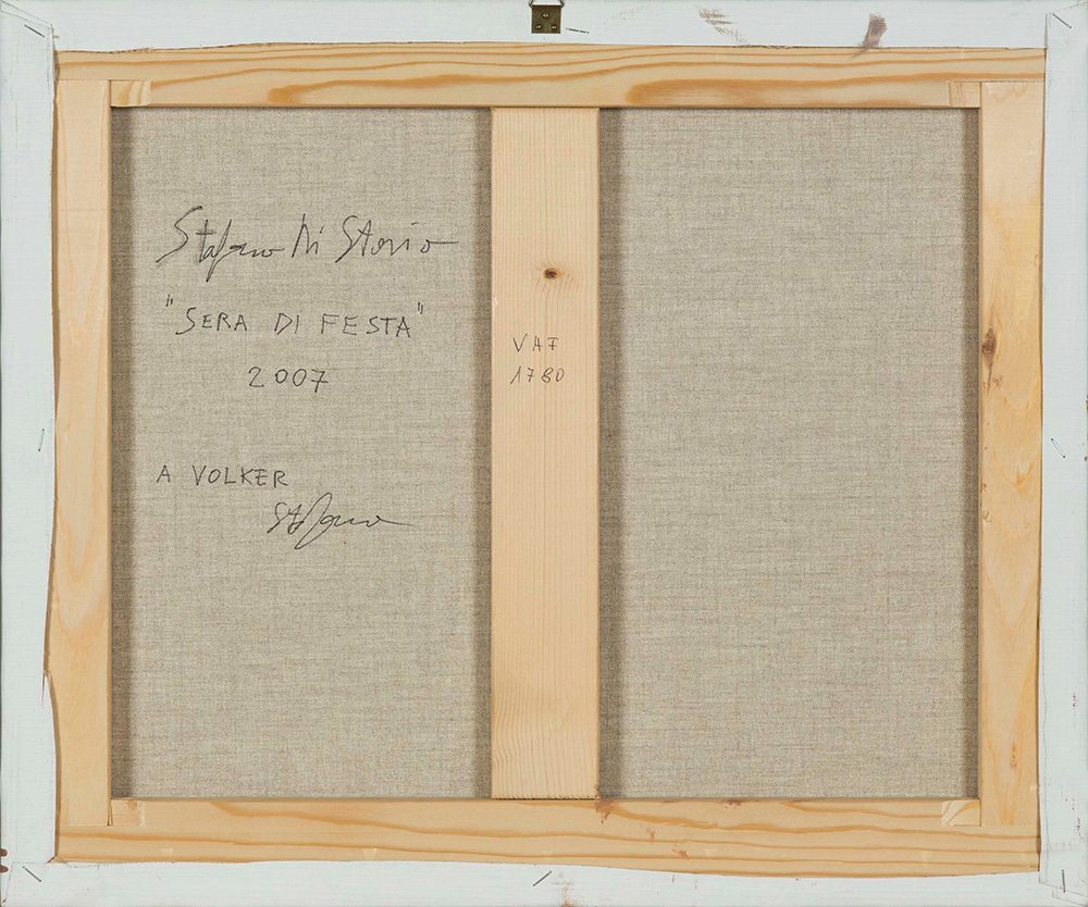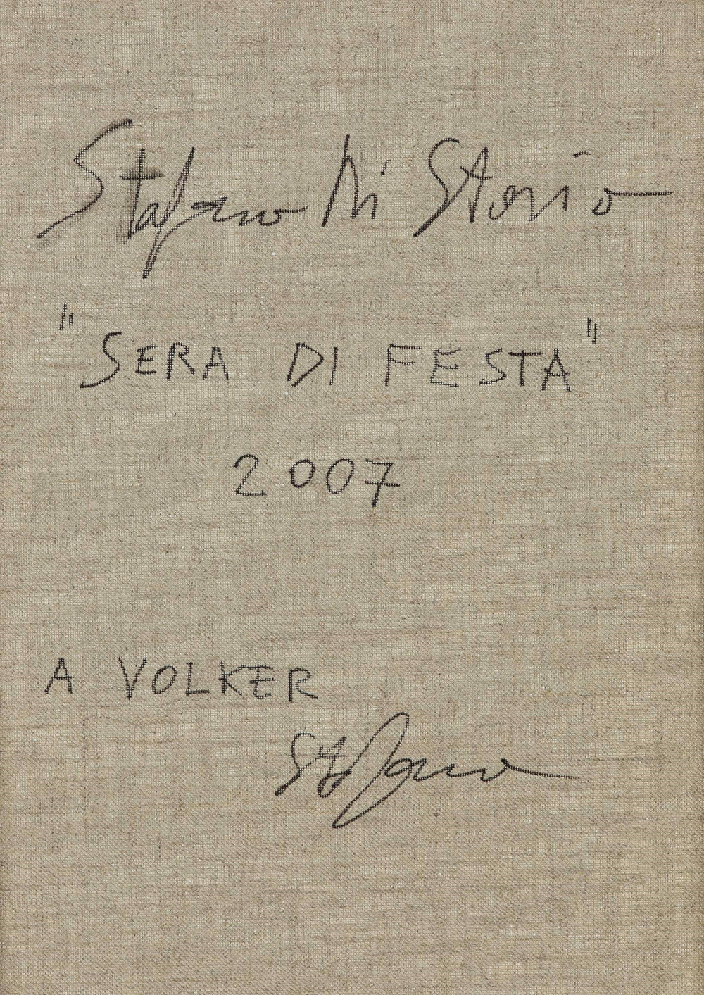 Stefano Di Stasio (1948), Sera di festa, 2007, acrilico su tela, cm 50x60 firmato, datato, intitolato e dedicato “a Volker” al retro , Provenienza: Collezione VAF Stiftung, Francoforte sul Meno (n.1789) Bibliografia: VAF Stiftung La collezione, Catalogo generale, a cura di Daniela Ferrari, Silvana Editoriale, 2012, p. 490 col n. VAF 1789