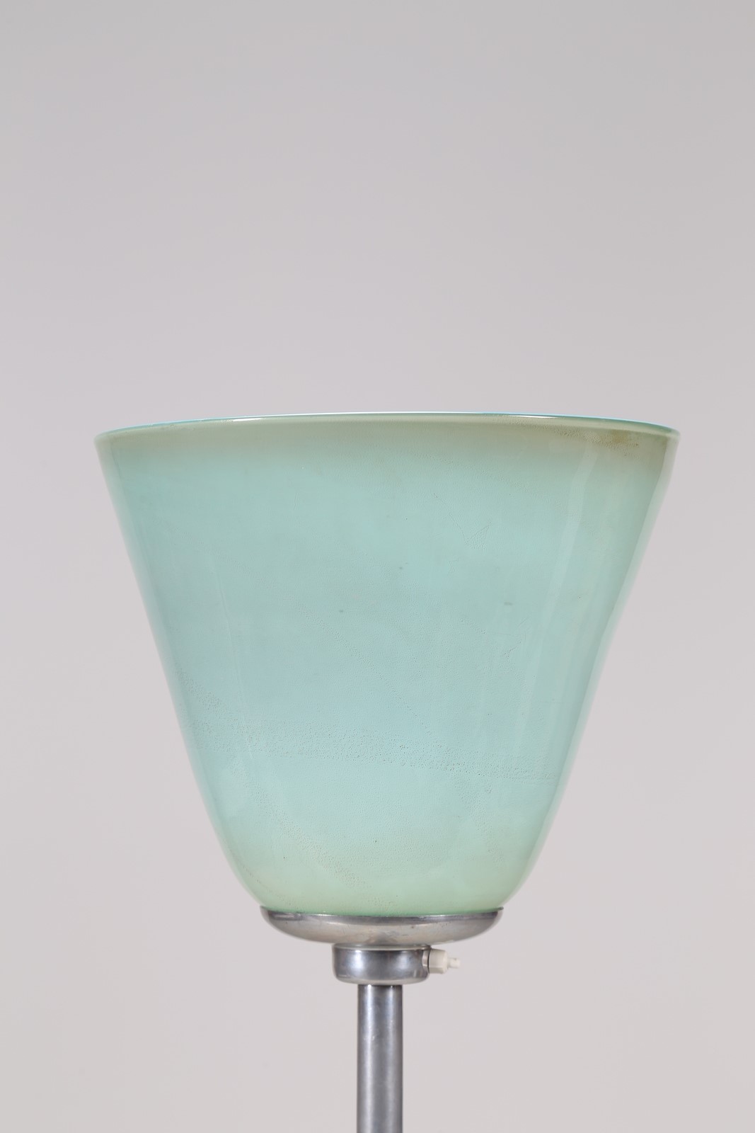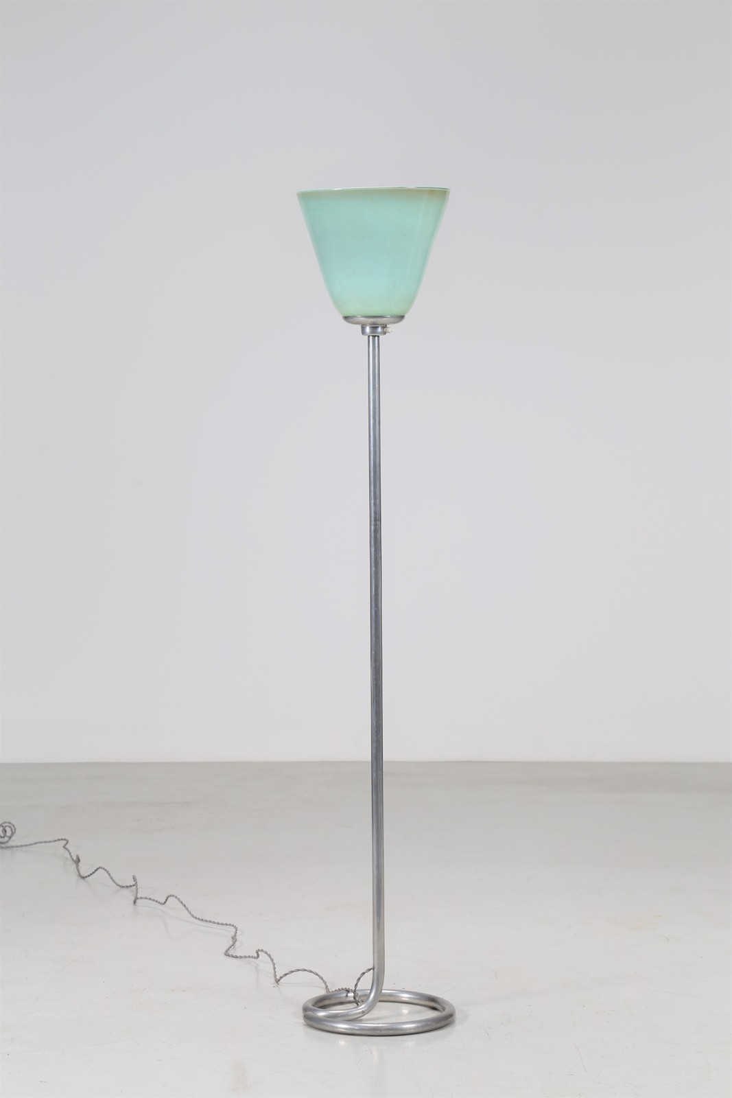 BUZZI TOMASO (1900 - 1981) Lampada da terra con struttura in metallo cromato e diffusore in vetro e applicazione di foglia d'oro, mod.503, per Venini, Italia, 1930. . . Cm 32,00 x 169,00. Pubblicazioni; La lampada è stata utilizzata per il libro, M. Barovier, Tomaso Buzzi alla Venini, Skira, 2014.