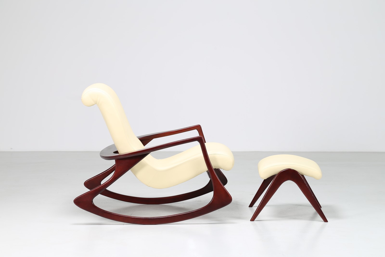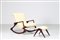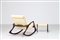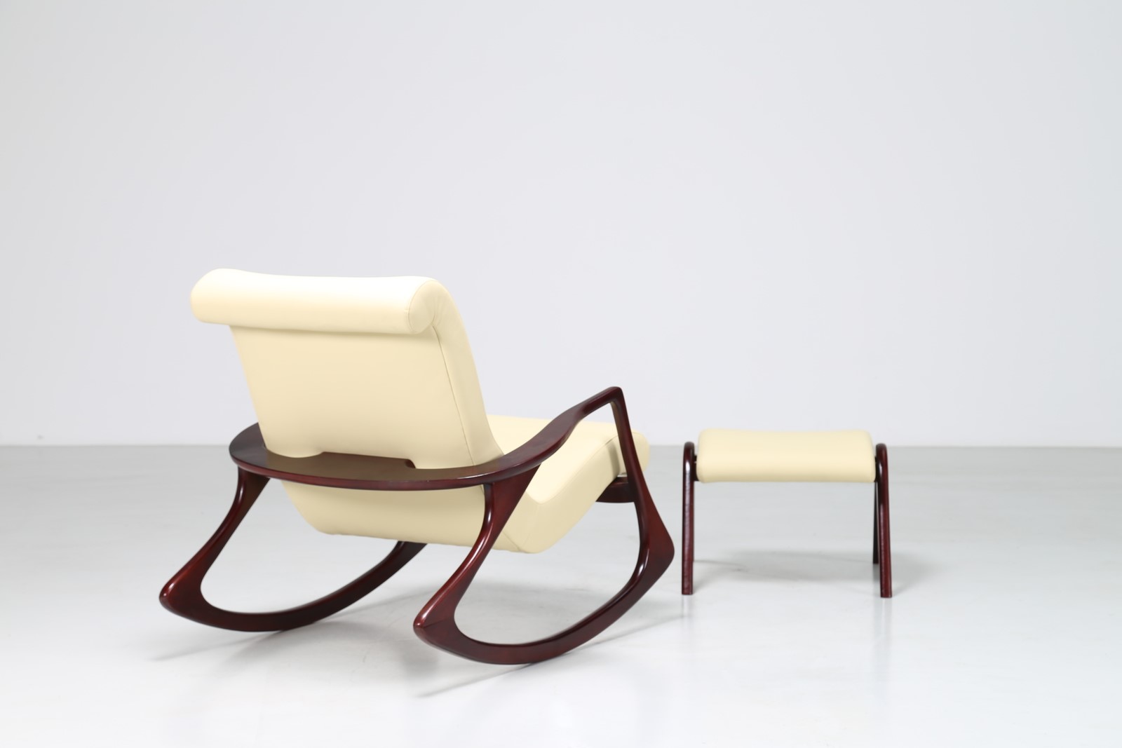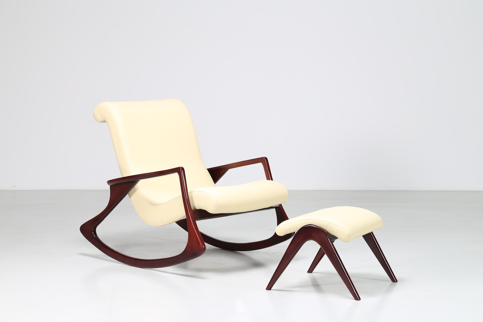 KAGAN VLADIMIR Poltrona a dondolo con pouf in mogano e skai, anni 60. -. Cm...