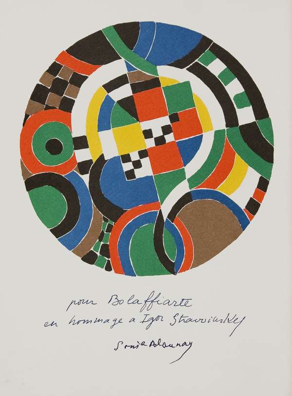 Sonia Delaunay Euterpe riproduzione litografica a 7 colori offset,es. 3689/5000 cm. 28x21 Firma in basso al centro Dichiarazione di autenticità con timbro a secco a cura della BolaffiArte in basso a sx In basso al centro dedica ad Igor Stravinsky,opera scelta dall'artista prima della sua scomparsa