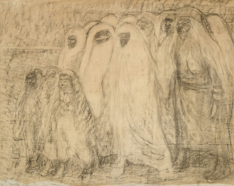 Moses Levy (Tunisi Viareggio 1968) Processione araba, 1909 c.a. Carboncino su carta, cm. 43x56. Sul verso firma e altro schizzo. Esposizione: "Dallo studio di Moses Levy alla collezione di Enrico Pea", incisioni, disegni e carboncini realizzati prima del 1916, dal 17 Febbraio - 11 Marzo, 2012, Sala dei Putti e del Capitolo, Chiostro di Sant’Agostino, Pietrasanta, a cura di Antonella Serafini e Valentina Fogher, pubblicato sul catalogo della mostra, a pag. 52