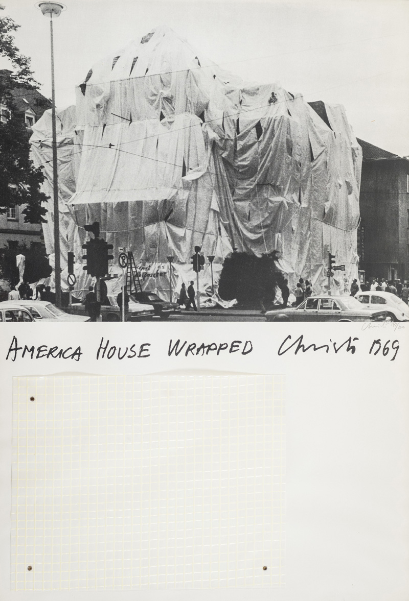 Christo and Jeanne- Calude (1935) American House Wrapped, Heidelberg, 1969 Serigrafia su carta con collage eseguito con il polietilene precedentemente usato usato per incartare l'edificio, cm. 90x62,5, es. 147/200. Photographer: Jochen Goetze. Printer : Druckerei Ebner, Aglasterhausen. Firma e tiratura sul lato destro. Sul verso: Etichetta "Galerie 3x10", Rothrist, Svizzera. Pubblicato su Christo and Jeanne-Claude, Edition Staeck, Heidelberg.