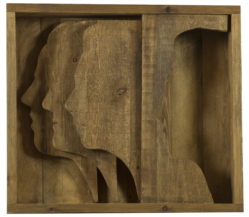 Mario Ceroli (Castelfrentano (Ch) 1938 ) Profili, anni '70 Accumulazione di legno, cm. 58x65x11,5. Firmato sul lato destro in basso. Autentica dell'Artista su foto.