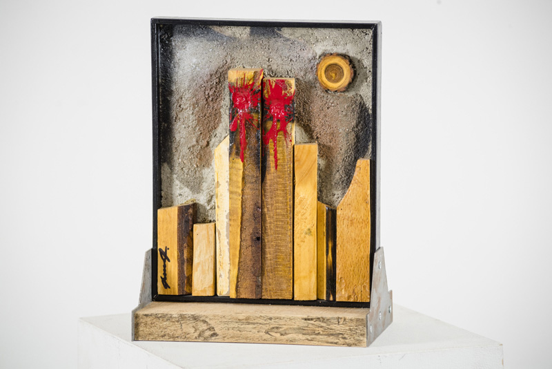 Pierluigi De Lutti (Monfalcone (Go) 1959 ) Doppia ferita, 2013 Tecnica mista e accumulazione di legno e acciaio, cm. 28,7x22x13. Sul verso: firma, data, titolo, timbro e Archivio n° 041TM2136.