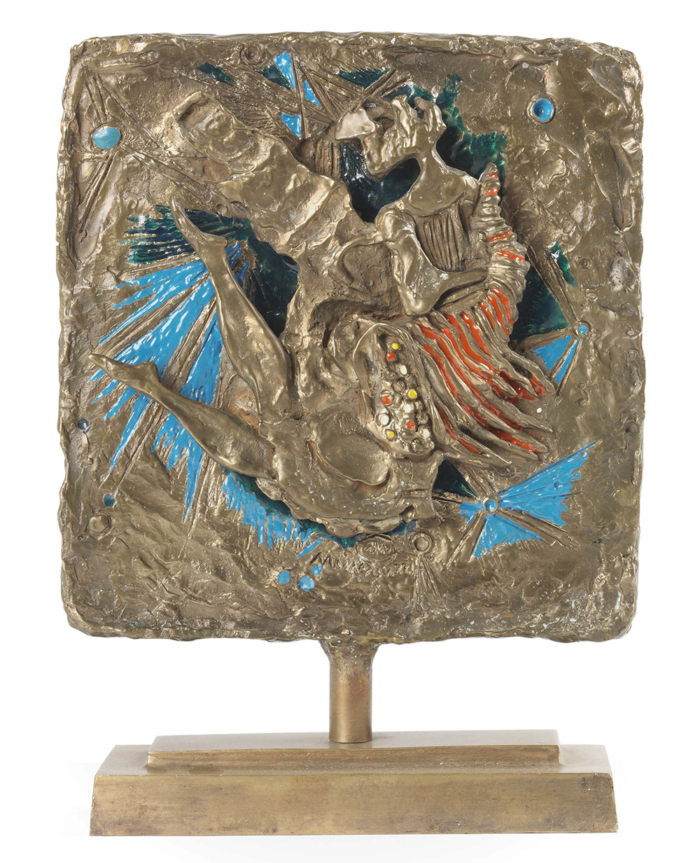 Luciano Minguzzi Bologna 1911 - Milano 2004 La fortuna Bassorilievo in bronzo, multiplo, es. I/XXV, cm. 36,5x26,5x3 (con base) Titolo, firma e tiratura al verso: La fortuna / M. / Minguzzi / I/XXV: due punzoni di fonderia
