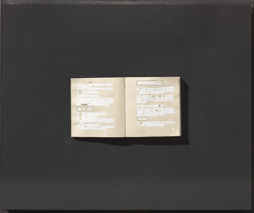 Emilio Isgrò Barcellona Pozzo di Gotto (Me) 1937 Libro per un compleanno, 1990 Intervento su libro applicato su tavola in teca di plexiglass, cm. 6x11 (libro), cm. 22x27x7 (teca) Titolo, firma dedica e data al verso: Libro per un compleanno / Emilio Isgrò / a Giancarlo con affetto / Emilio / 4 aprile 1990. Foto autenticata dall'artista, Milano, 2 novembre 2017.