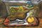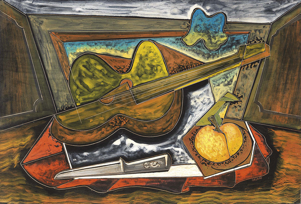 Pippo Oriani Torino 1909 - Roma 1972 Grande guitare Encausto e graffito su cartone, cm. 30x43,7 Firma in basso a destra: Oriani; titolo, data e dichiarazione di autenticità al verso: "Grande guitare" / Periodo parigino / È mio / Pippo Oriani: timbro Galleria Regoni, Torino.