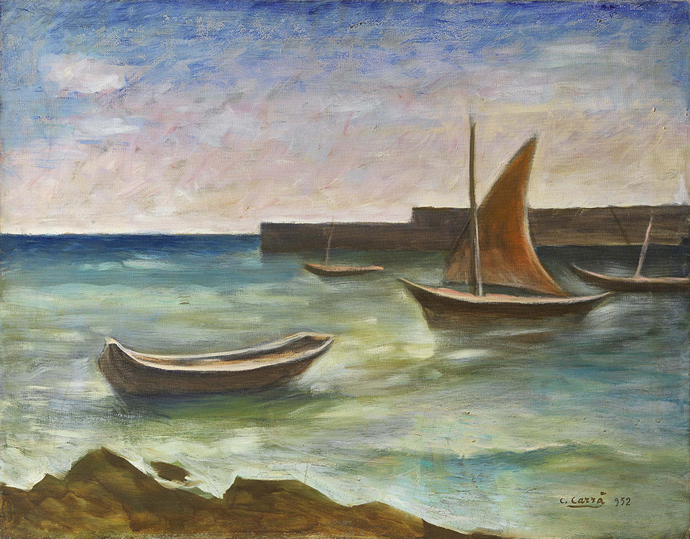Carlo Carrà Quargnento (Al) 1881 - Milano 1966 Marina, 1952 Olio su tela, cm. 69,7x90 Firma e data in basso a destra: C. Carrà 952. Al verso sulla tela: etichetta con n. 8835 e timbro Galleria Annunciata, Milano; sul telaio: timbro Galleria Annunciata, con n. 2748. Storia Galleria Michaud, Firenze; Collezione J. Mignoni Strada, Rapallo; Collezione privata Bibliografia Massimo Carrà, Carrà, tutta l'opera pittorica volume III, 1951-1966, L'Annunciata / La Conchiglia, Milano, 1968, pp. 73, 571, n. 11/52.