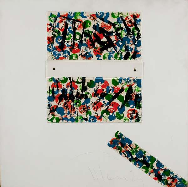 Aldo Mondino Senza titolo – 1972 tecnica mista su tela con applicazione cm. 80x80 Firma in basso al centro Autentica dell'Archivio Aldo Mondino n. 20080921215512 L'opera presenta un piccolo taglio in basso a dx