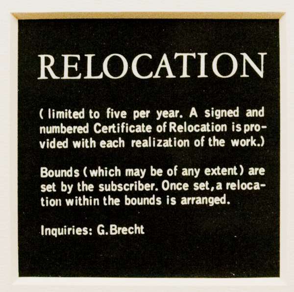 George Brecht Relocation – 1962 Card (Advertising Card from "Water-Yam") cm. 8x8 Opera pubblicata in Fluxus Codex, pag. 209 riprodotto