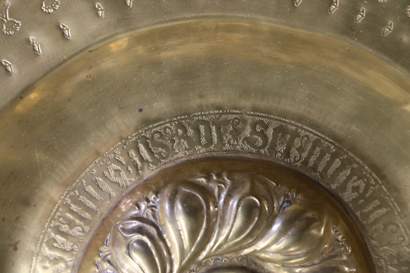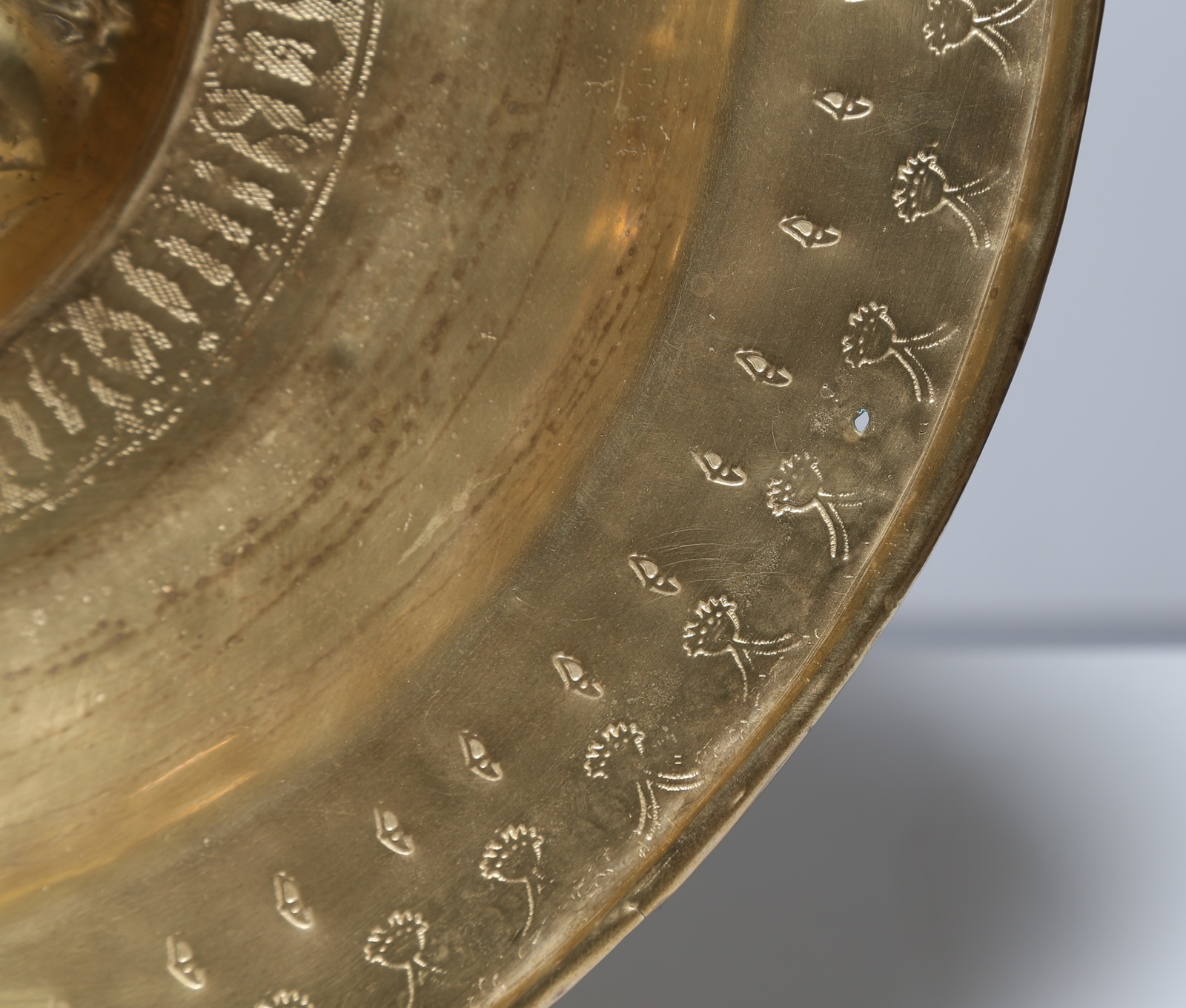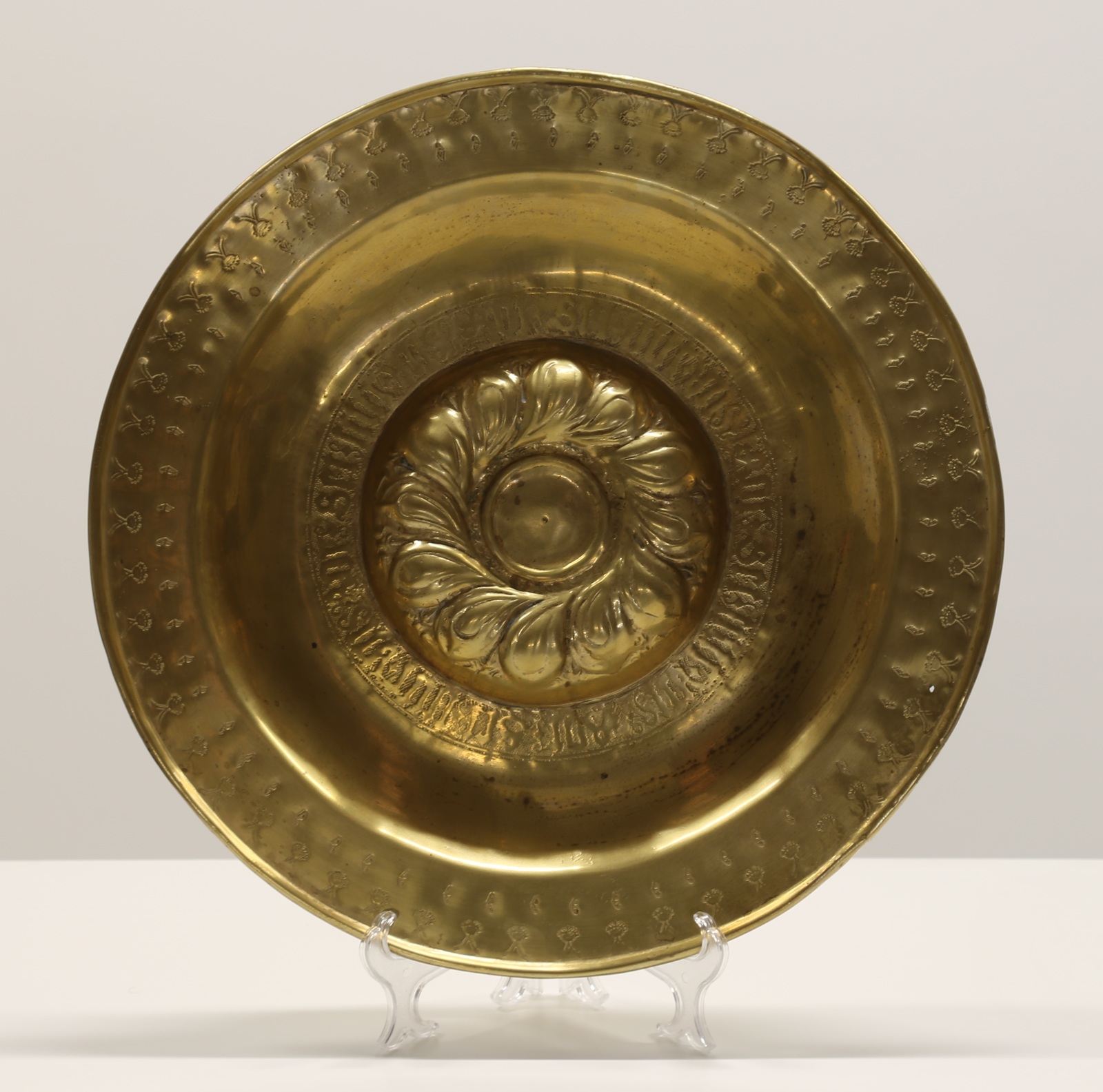 MANIFATTURA VENEZIANA DEL XVII SECOLO Piatto elemosiniere in ottone sbalzato, caratterizzato da umbone centrale a forma di corolla e da elementi stilizzati incisi a bulino posti in sequenza lungo la tesa. . Cm 46,00 x 5,00. Difetti.