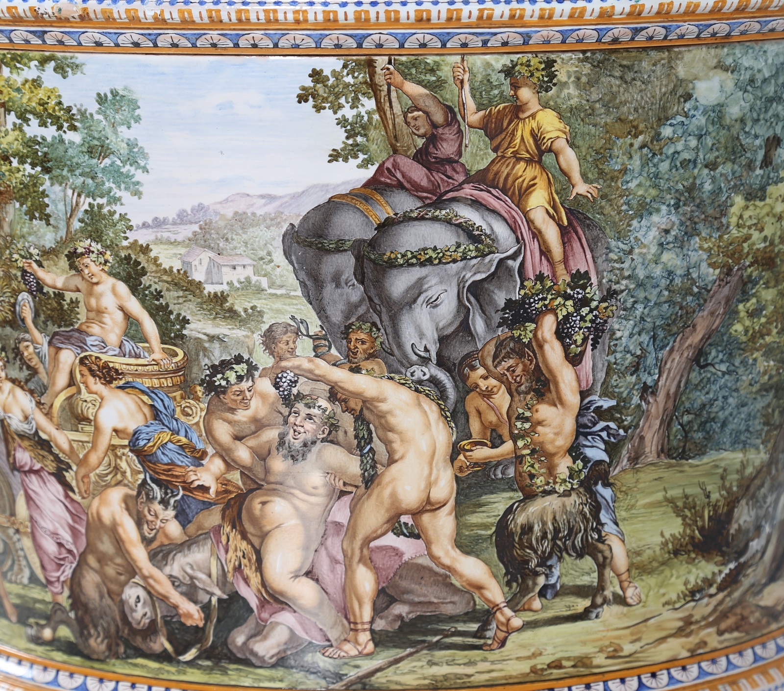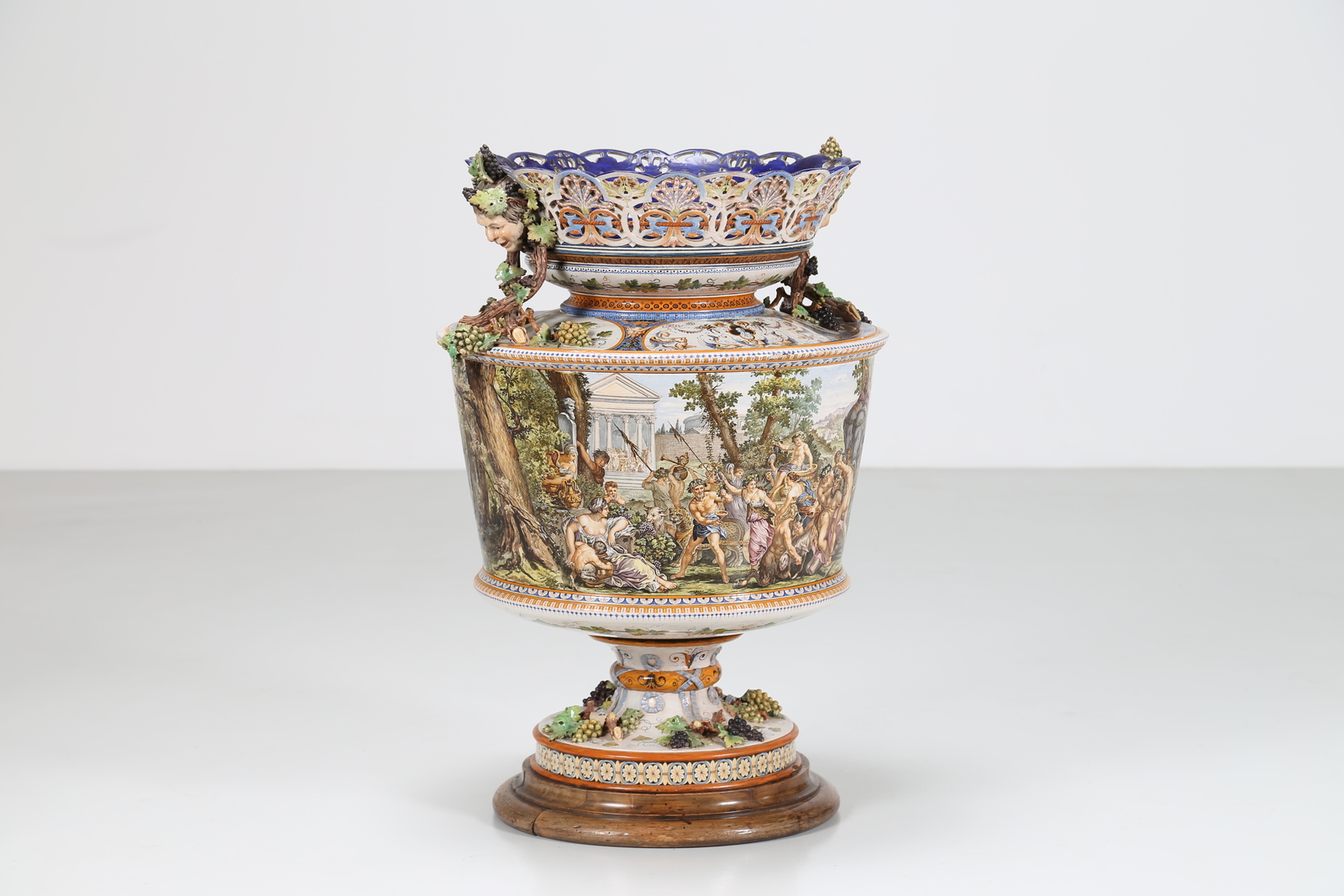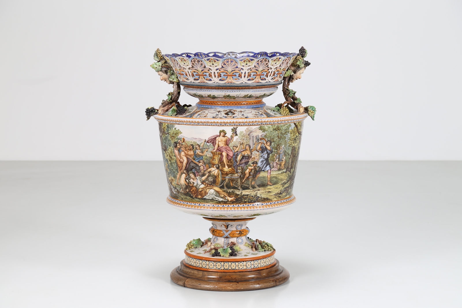 GINORI A DOCCIA (XIX SECOLO) Imponente Vaso Ginori, in maiolica policroma decorato con il "Trionfo di Bacco" tratto dal dipinto di Pietro da Cortonai, seconda metà del XIX secolo. . . Cm 68,00 x 89,00 x 65,00. Stampiglia Ginori alla base.