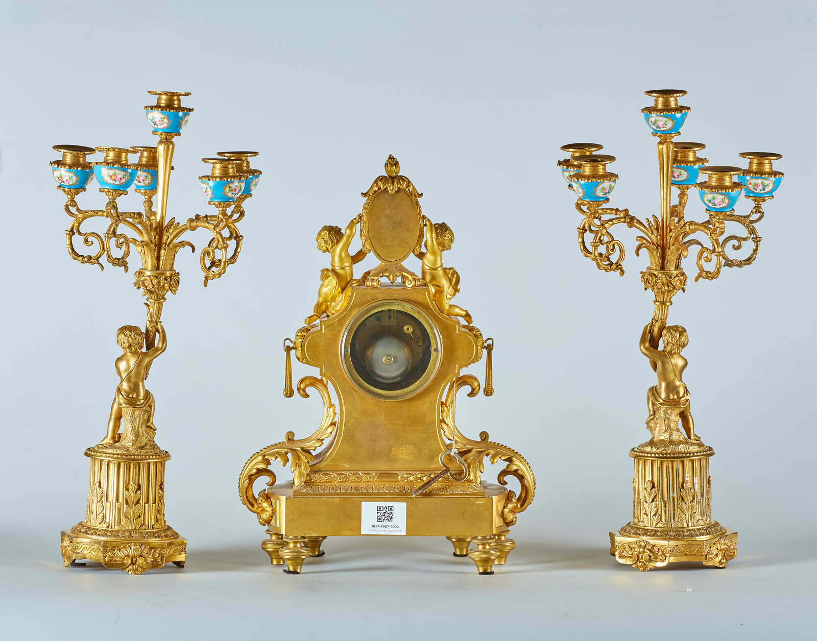 MANIFATTURA FRANCESE DEL XIX SECOLO Trittico composto da orologio e due candelabri in bronzo dorato con applicazioni in ceramica dipinta. . .