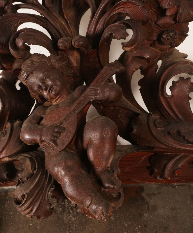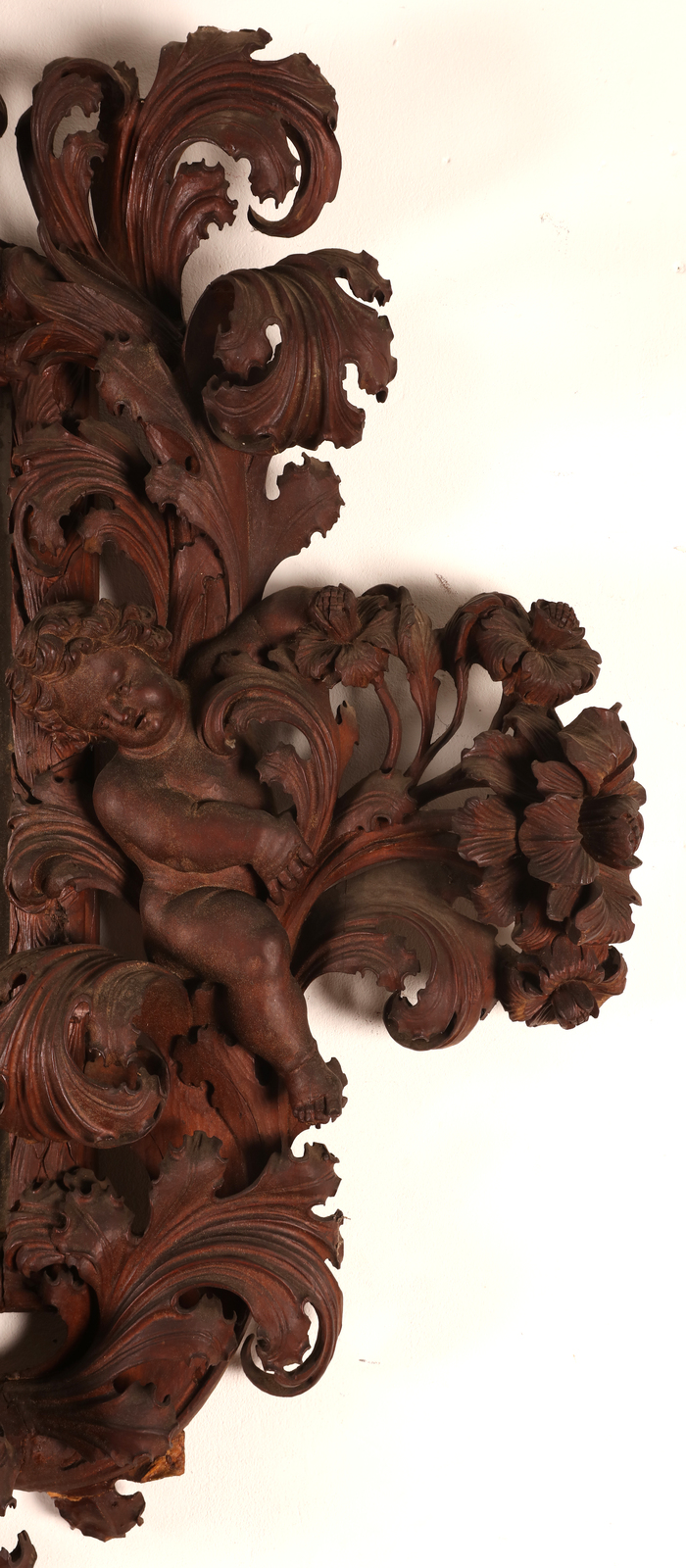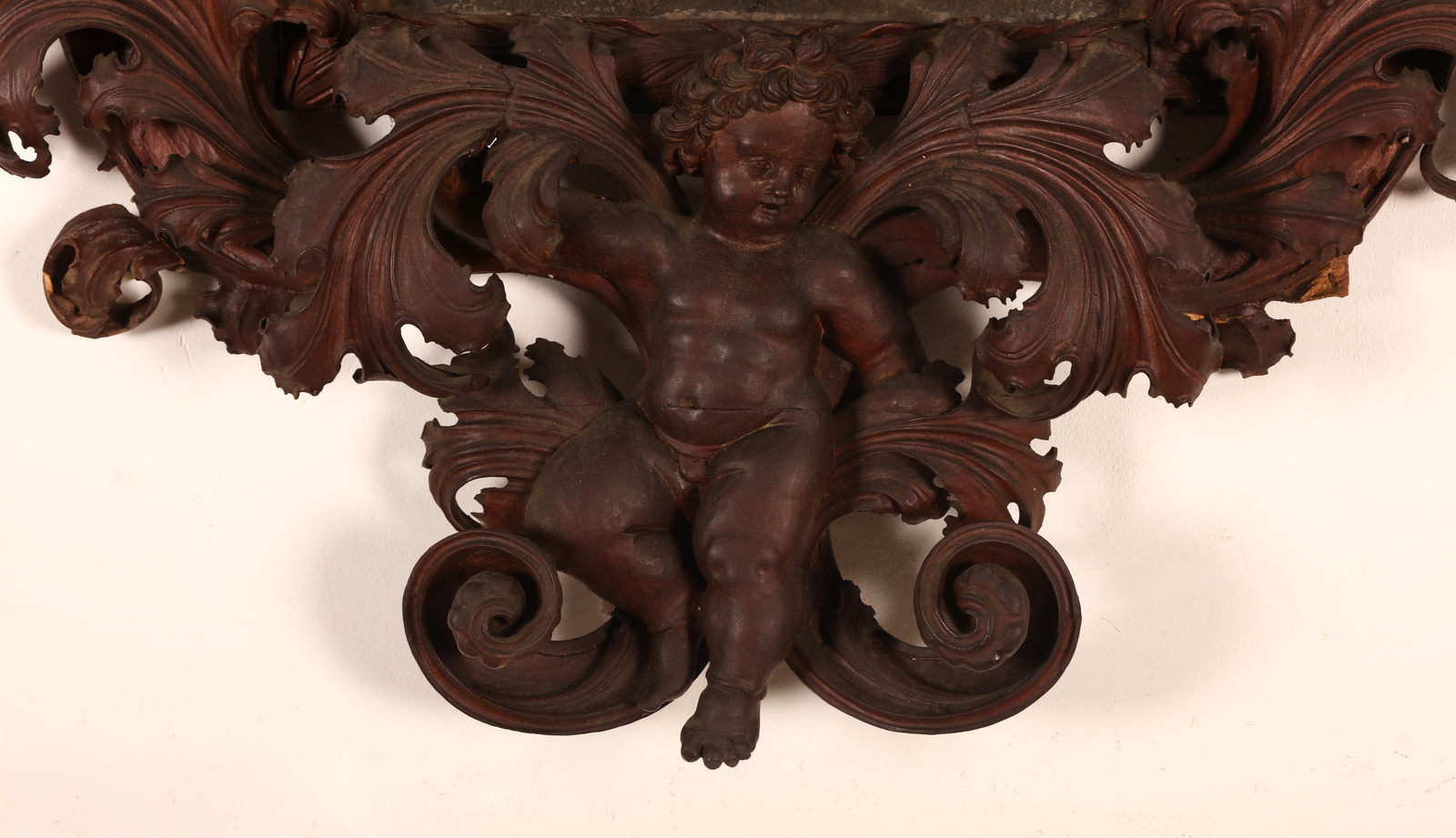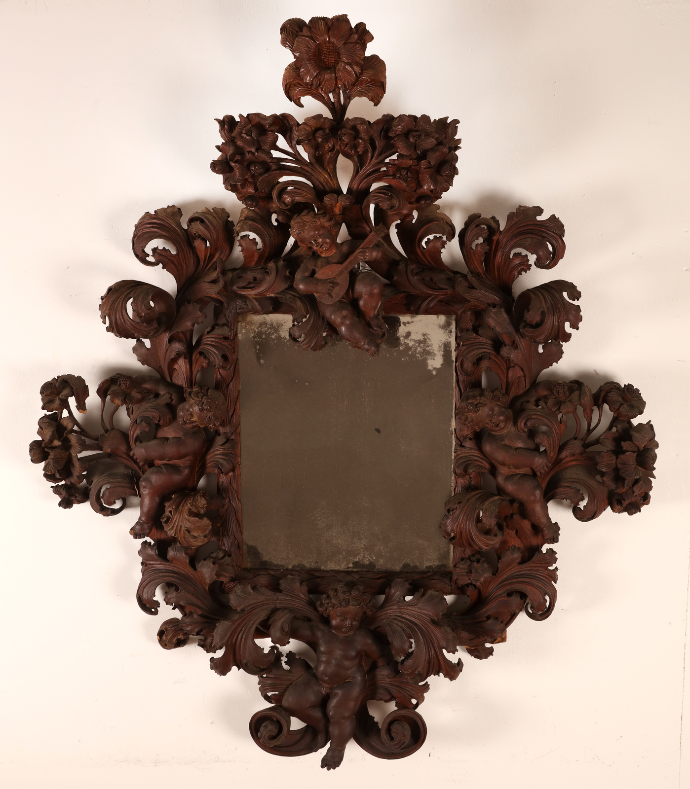 MANIFATTURA ITALIANA DEL XIX SECOLO Imponente specchiera in legno di noce intagliata a motivi fogliacei e amorini. . Cm 113,00 x 130,00. Difetti.