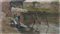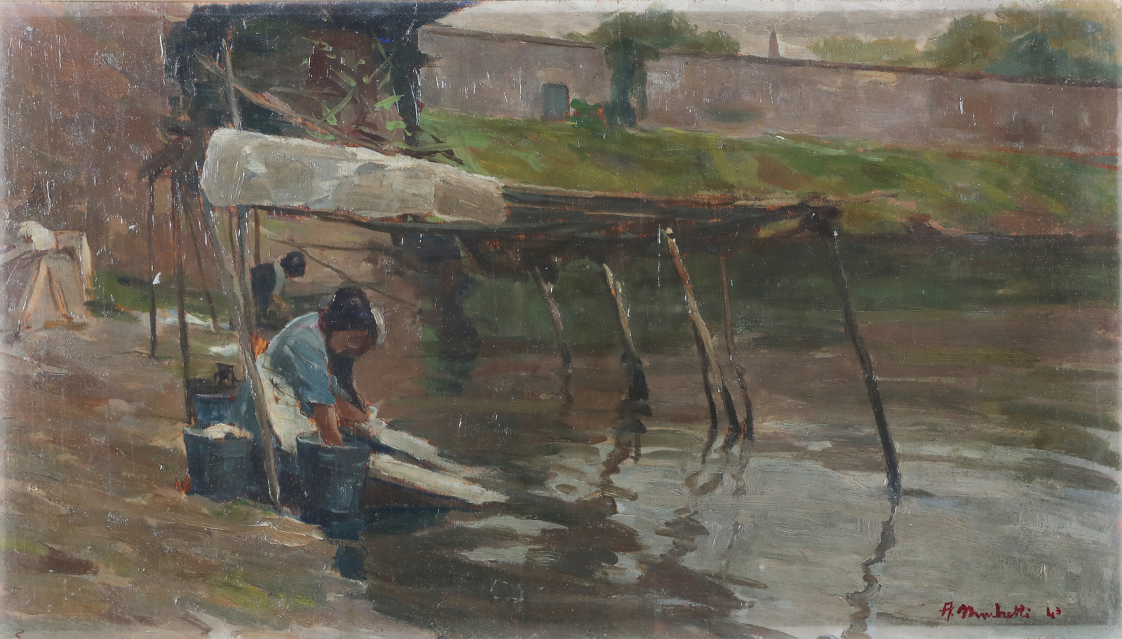 MUCCHETTI ANGELO (1912 - 1960) Lavandaie. Olio su faesite. Cm 48,00 x 27,00. Firmato in basso a destra. Timbro della galleria Il Salotto. . Cornice presente