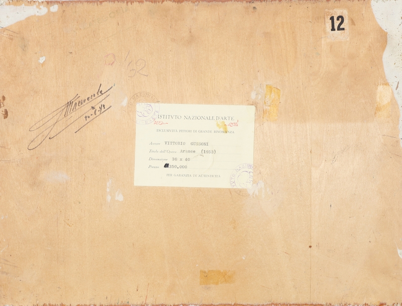 GUSSONI VITTORIO (1893 - 1968) Arance. 1953. Olio su tavola. Cm 40,00 x 30,00. Firma in basso a sinistra. Al retro cartiglio descrittivo Istituto Nazionale d'Arte. . Cornice presente