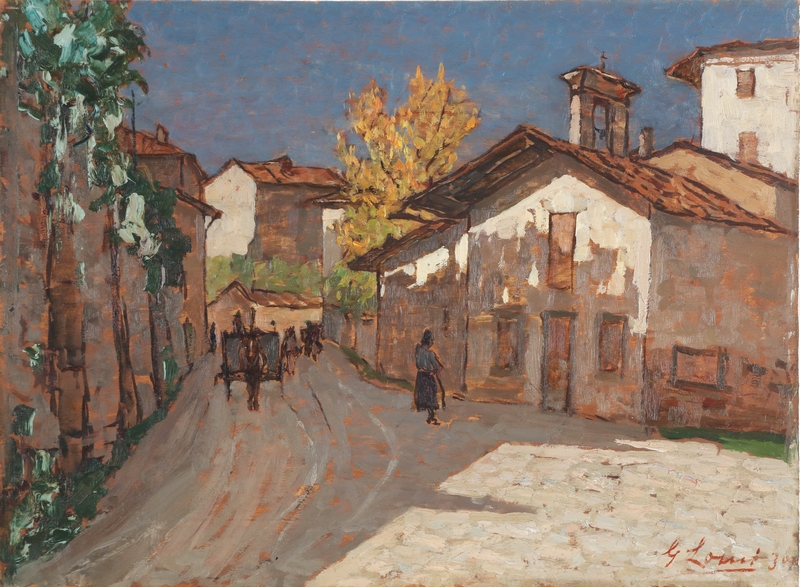 LOMI GIOVANNI (1889 - 1969) Bergamo alta, mattina. 1939. Olio su tavoletta. Cm 36,00 x 26,00. Firma e anno in basso a destra. Titolo al retro. Cornice presente