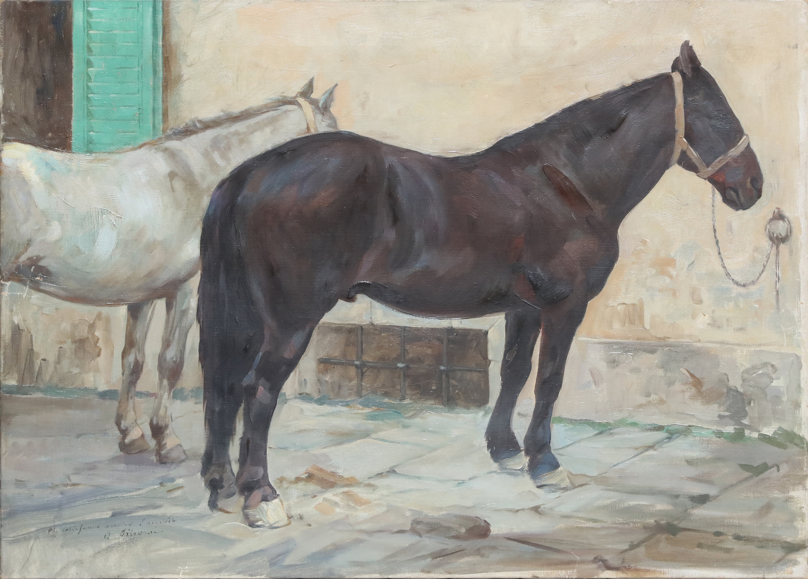 PANERAI RUGGERO (1862 - 1923) Cavalli in scuderia. Olio su tela . Cm 70,00 x 50,00. Firma e dedica in basso a sinistra. Cartiglio della casa d'aste meeting art sul retro. Cornice presente