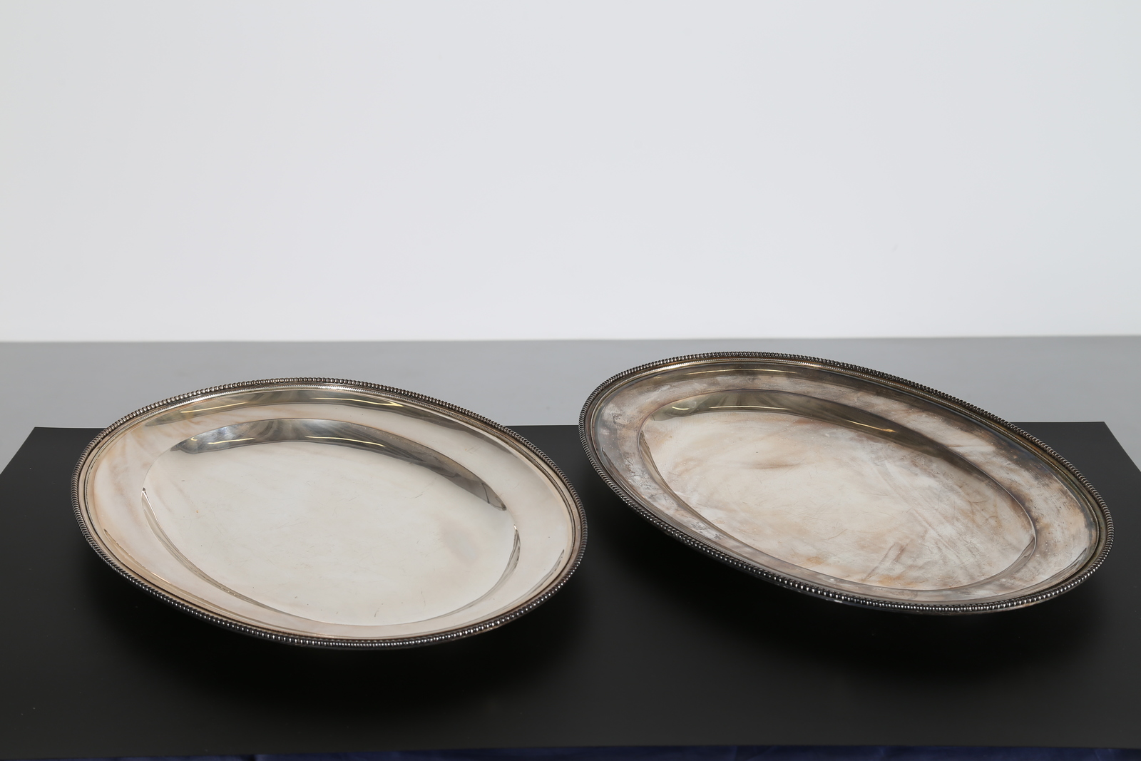 MANIFATTURA ITALIANA DEGLI INIZI DEL XX SECOLO Coppia di piatti ovali. Argento. Cm 50,00 x 2,50 x 37,00. Al fondo R. Miracoli Milano e marchio di fabbrica. Peso 3,80 Kg.