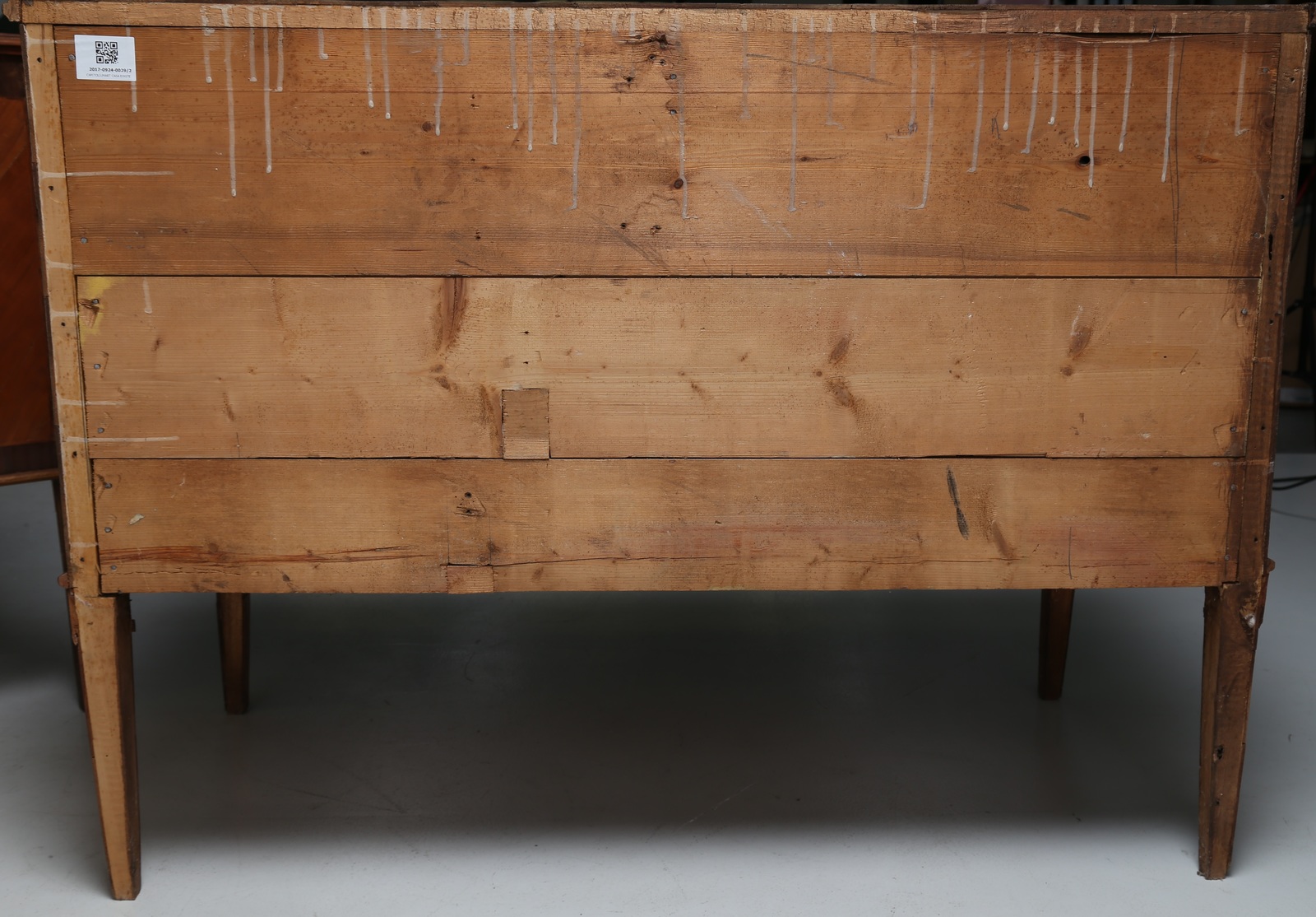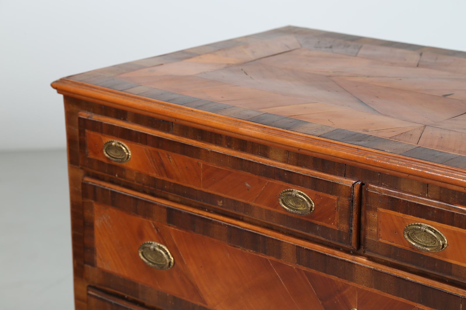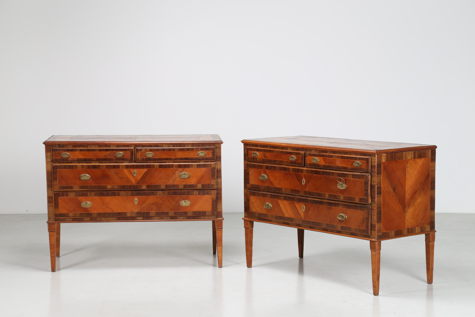 MANIFATTURA LOMBARDA DEL XVIII SECOLO Coppia di cassettoni a quattro cassetti lastronati e filettati in legno di noce, bordi modanati, gambe a piramide rovesciata. . Cm 121,00 x 89,00 x 59,00.
