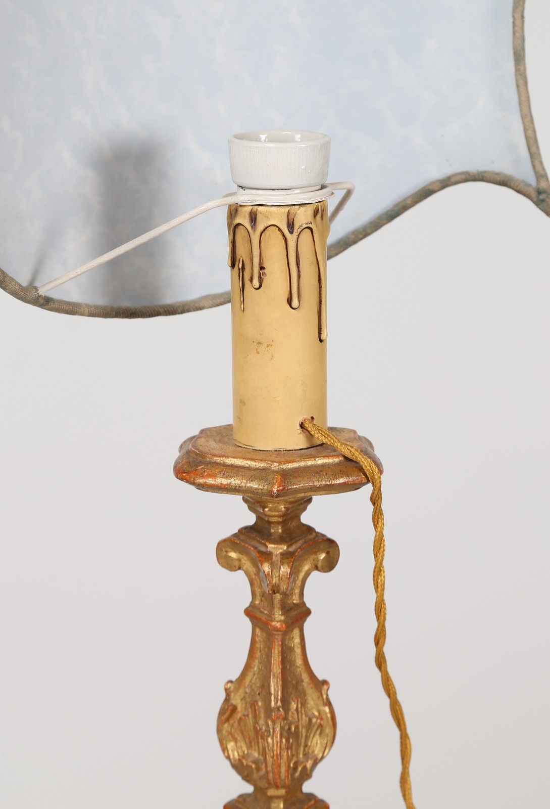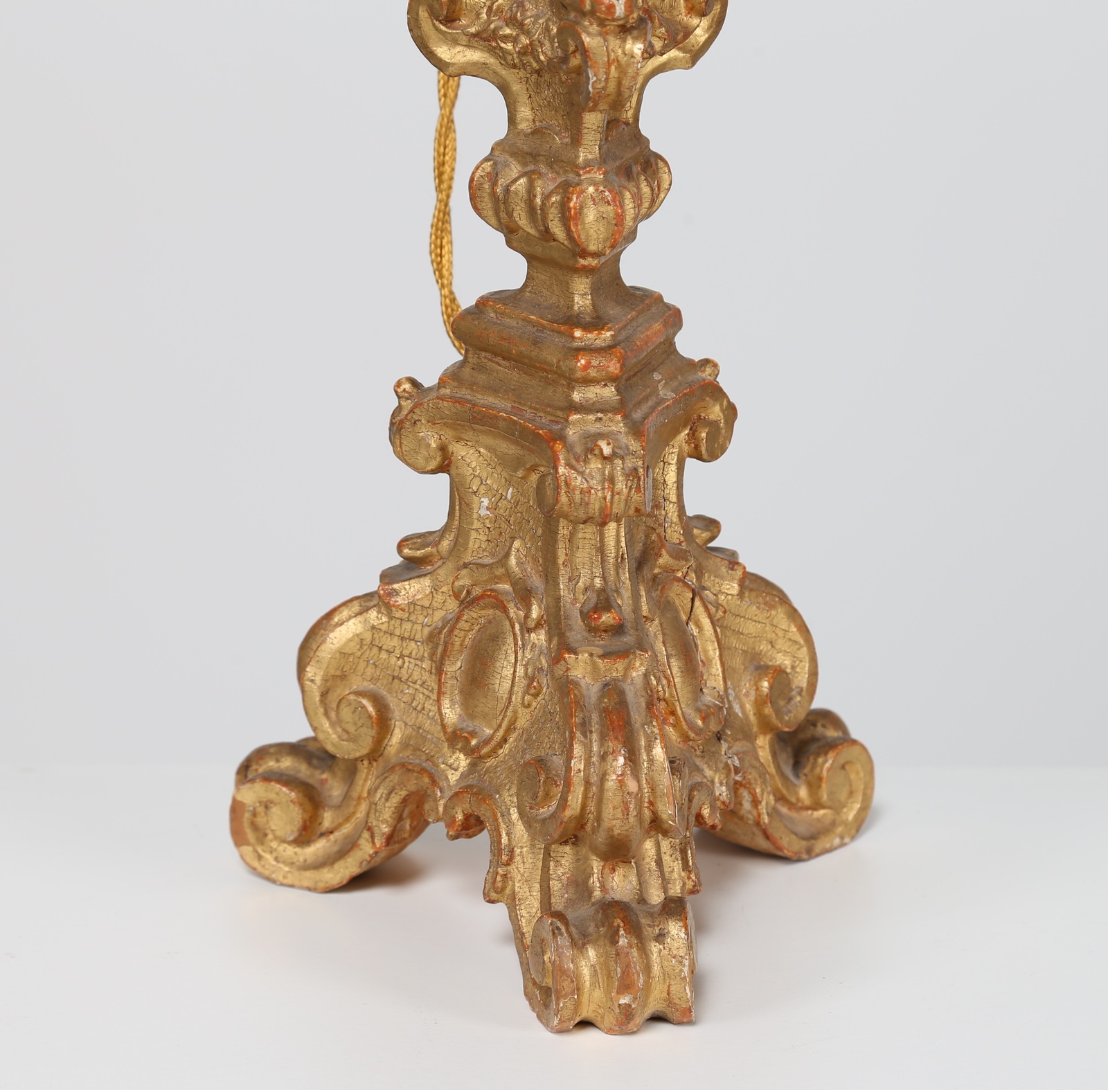 MANIFATTURA VENEZIANA DEL XVIII SECOLO Coppia di cendelabri in legno scolpito dorato. . Cm 37,00 x 72,00 x 21,00.