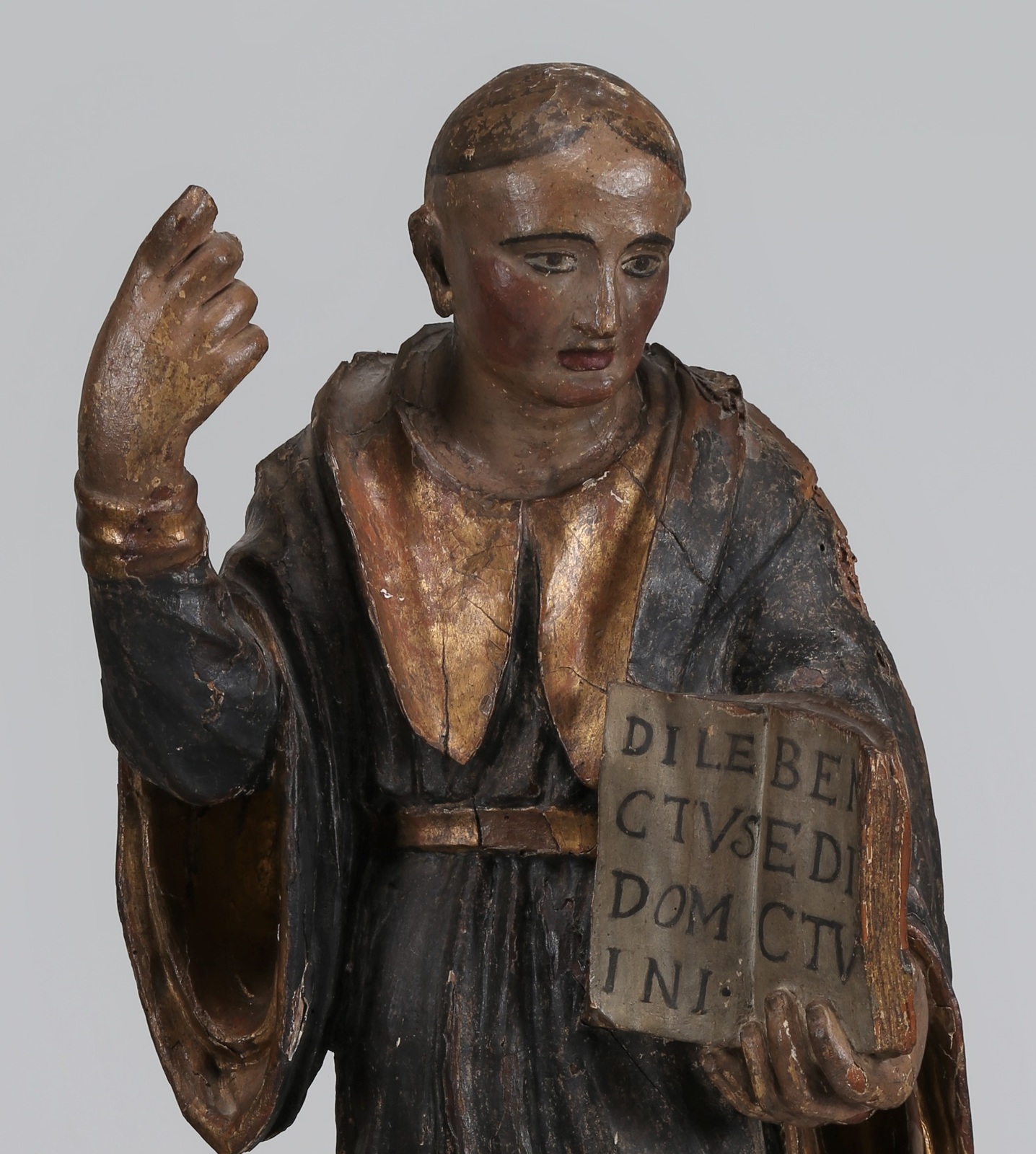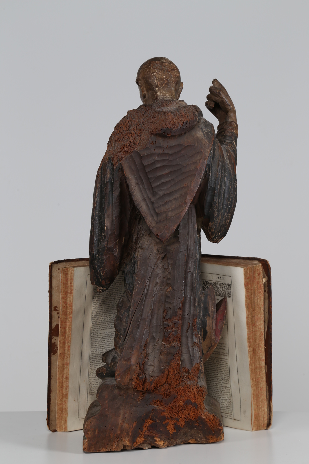 ARTISTA DEL XVII SECOLO. San Bonaventura e volume Summa Theologica. Scultura. Cm 31,00 x 79,00 x 29,00. Difetti.