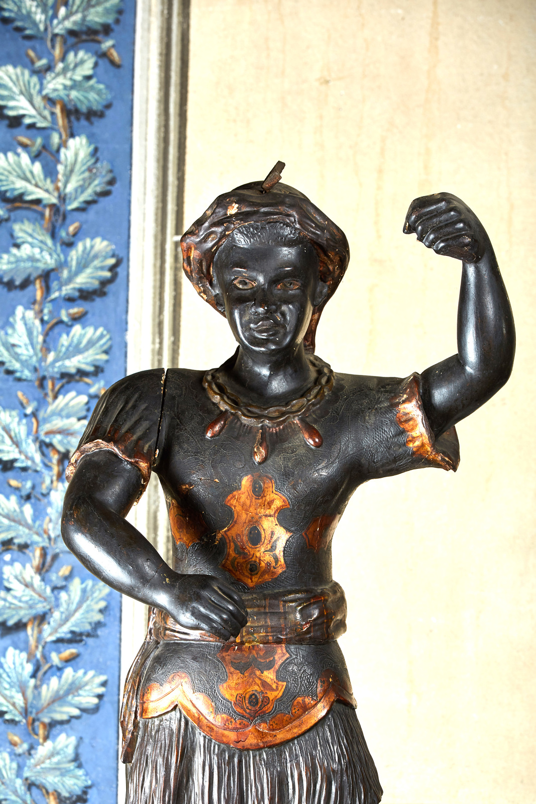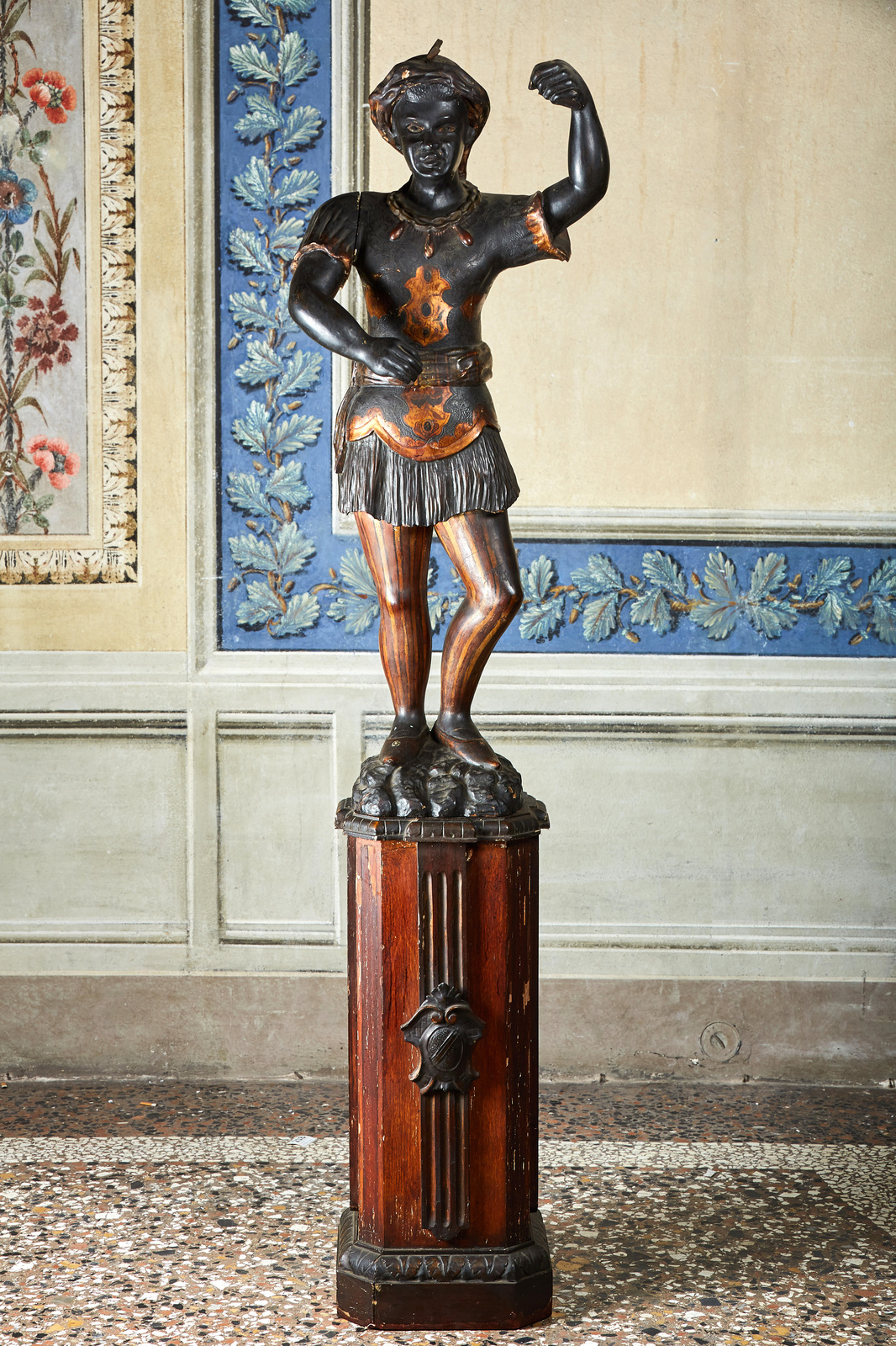 MANIFATTURA VENEZIANA DEL XIX SECOLO Moretto in legno scolpito e dorato. . Cm 120,00. Difetti e rotture.