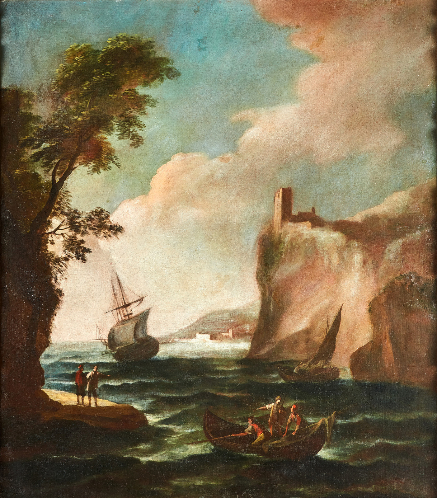 CIFRONDI ANTONIO (1657 - 1730) Seascape with port and figures. Oil on canvas . Cm 98,00 x 110,00. . Cornice presente